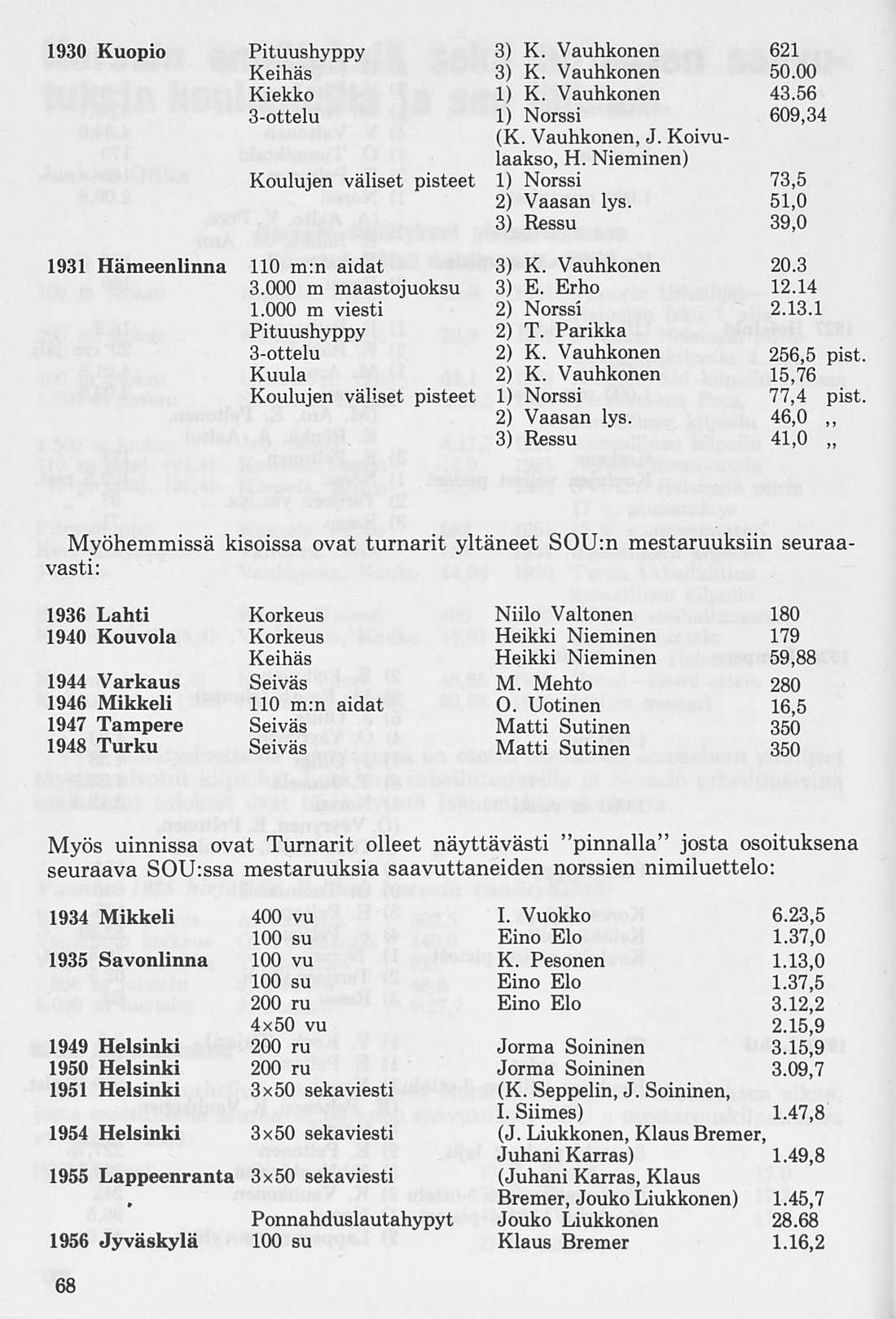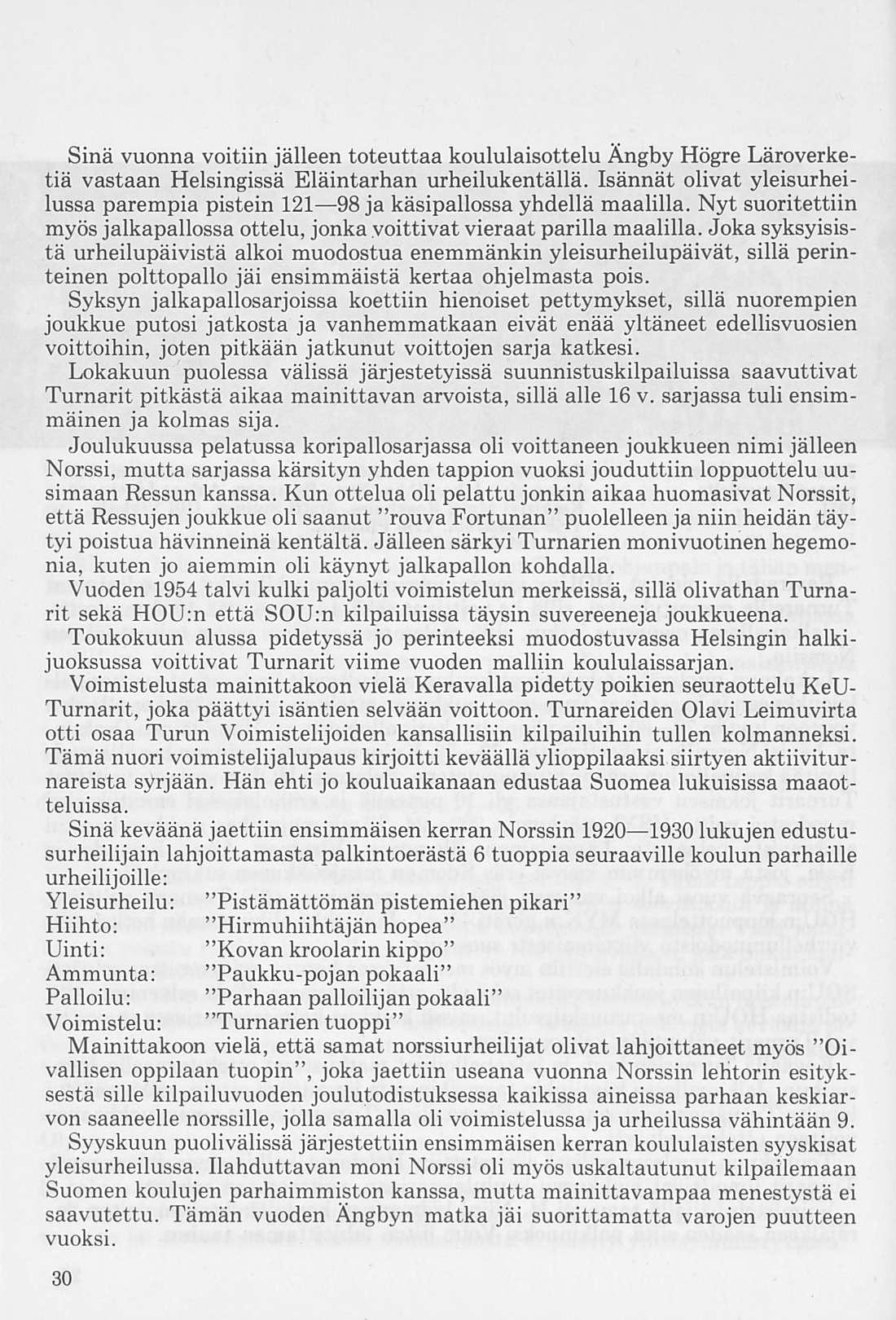 Alkuvuosien tunnetuimmat uimarikasvatit olivat olympiamiehet Toivo Aro ja Ilmari Niemeläinen, jotka jo koulupoikina voittivat vaativia kilpailuja. Ammunta oli aluksi useinkin Turnarien kompastuskivenä koulujen välisissä joukkuemoniotteluissa ns. ”kuparikilpi”-kilpailuissa, mutta myöhemmin nousi Turnareista enemmänkin mestariampujia ja vuoden 1937 ammunnan MM-kisojen joukkueessa oli neljä norssilaista.
