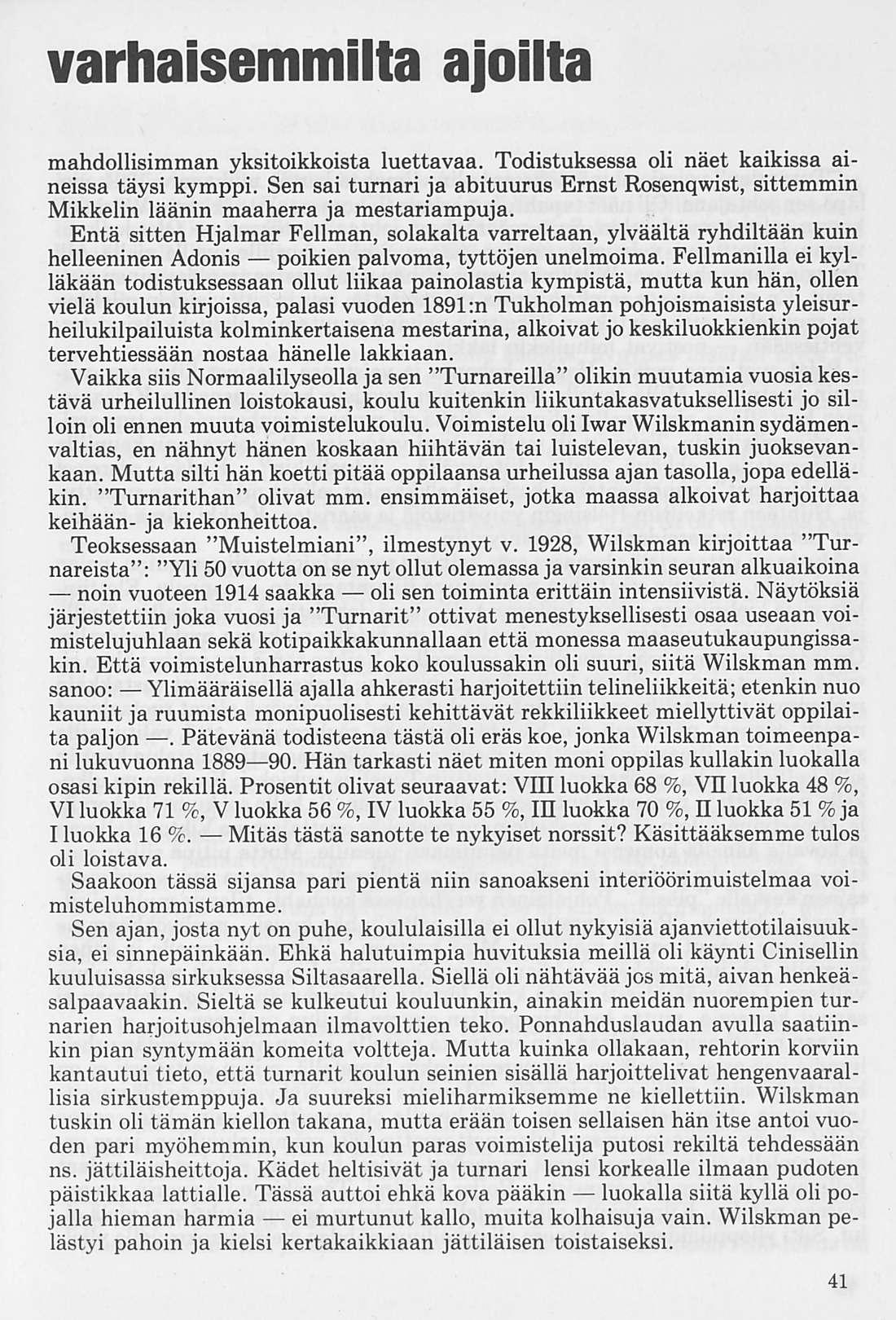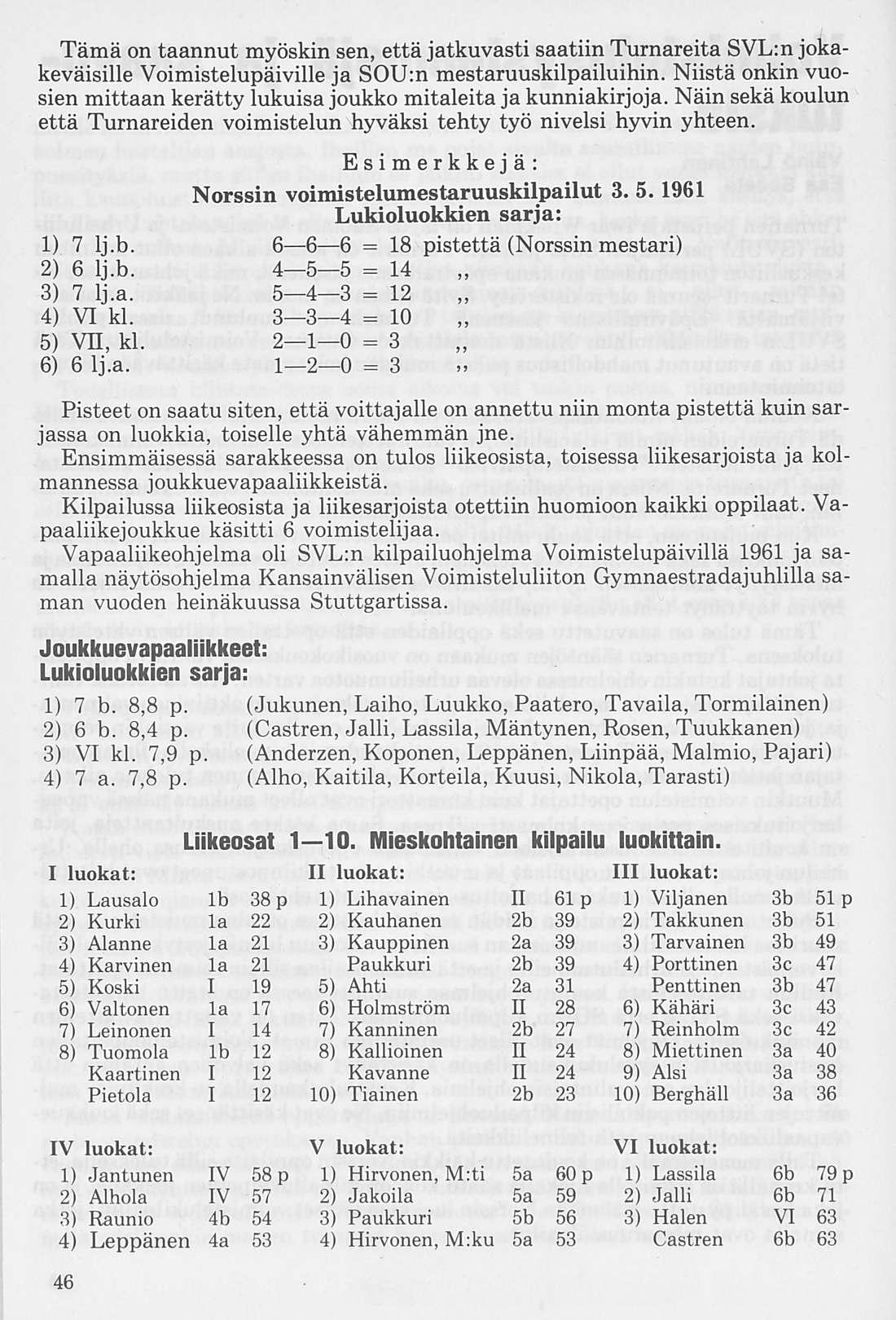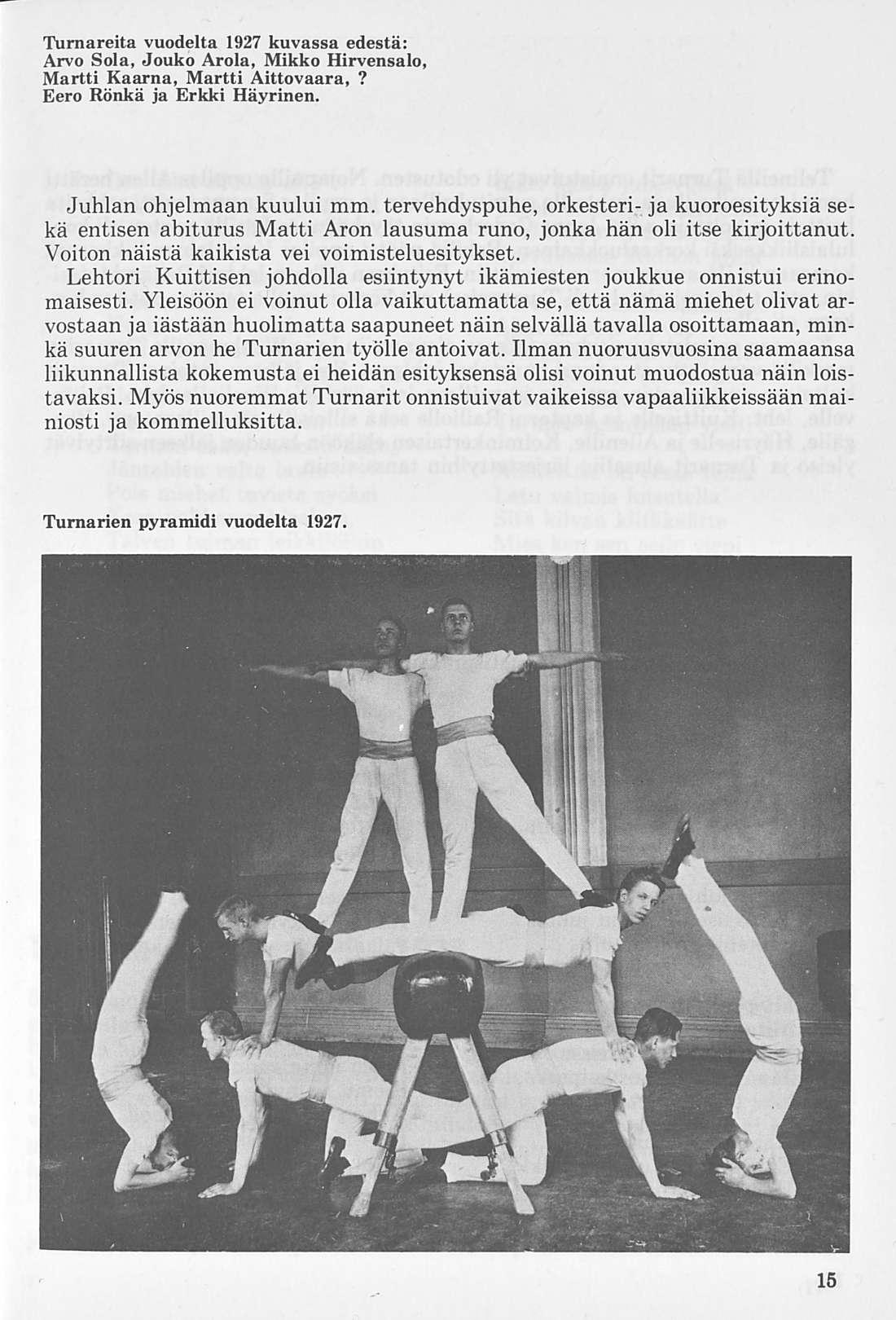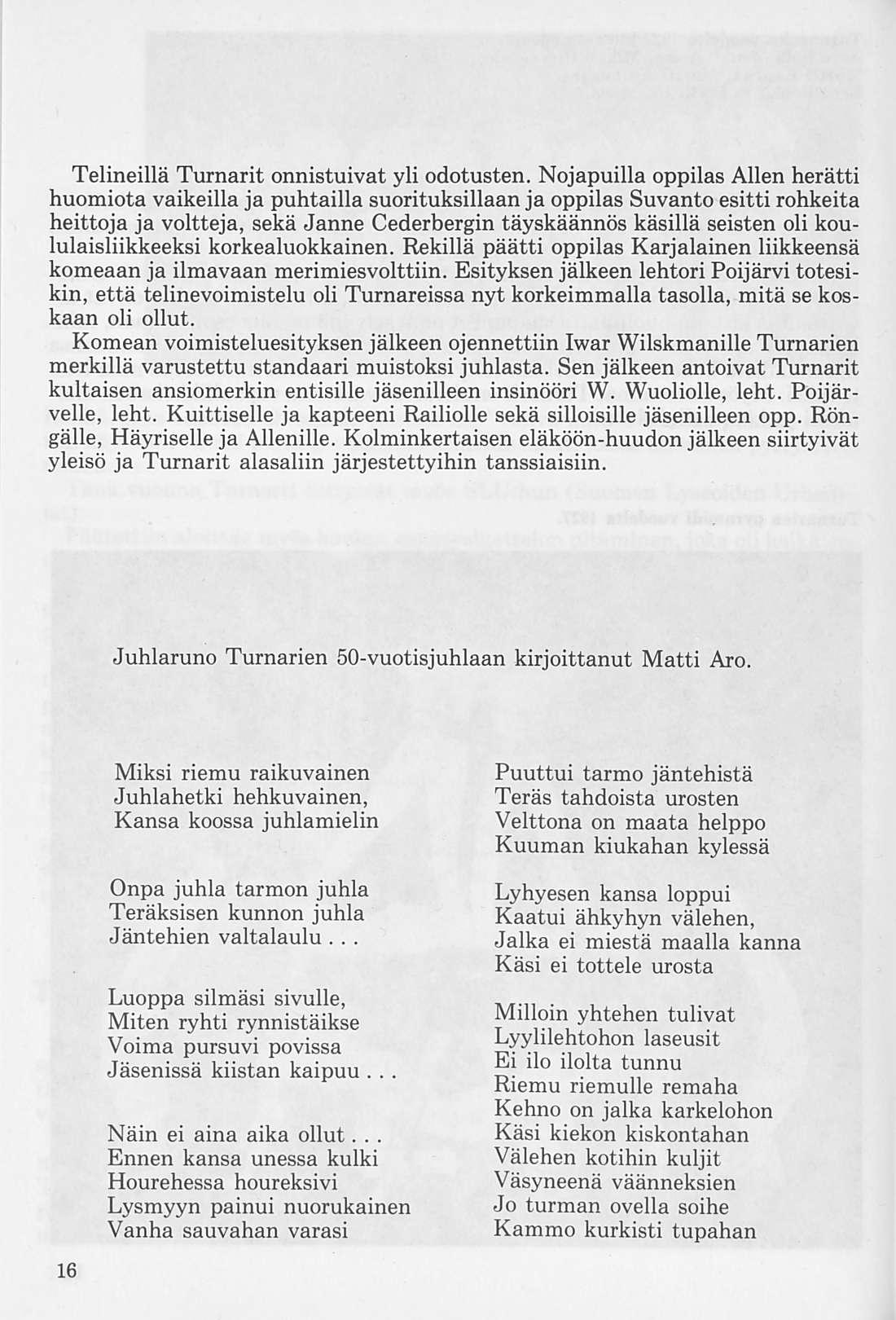 tavan sijan Euroopan muitten voimisteluseurojen piireissä. Sillä suomalaiselta sitkeydeltä, johon on yhdistettynä nuoruuden voima ja harrastus, saattaapi edellyttää suurtenkin tuloksien syntymistä.” Myös Turnarit saivat osan kiitoksesta, sillä tohtori Onni Ruuth mainitsee toimittamassaan Uljas-nimisessä lehdessä mm. seuraavaa:” Alkeisopiston voimisteluyhdistys ansaitsee kumminkin, jos ei etusijaa kaikista, niin toki erinomaista kiitosta.”