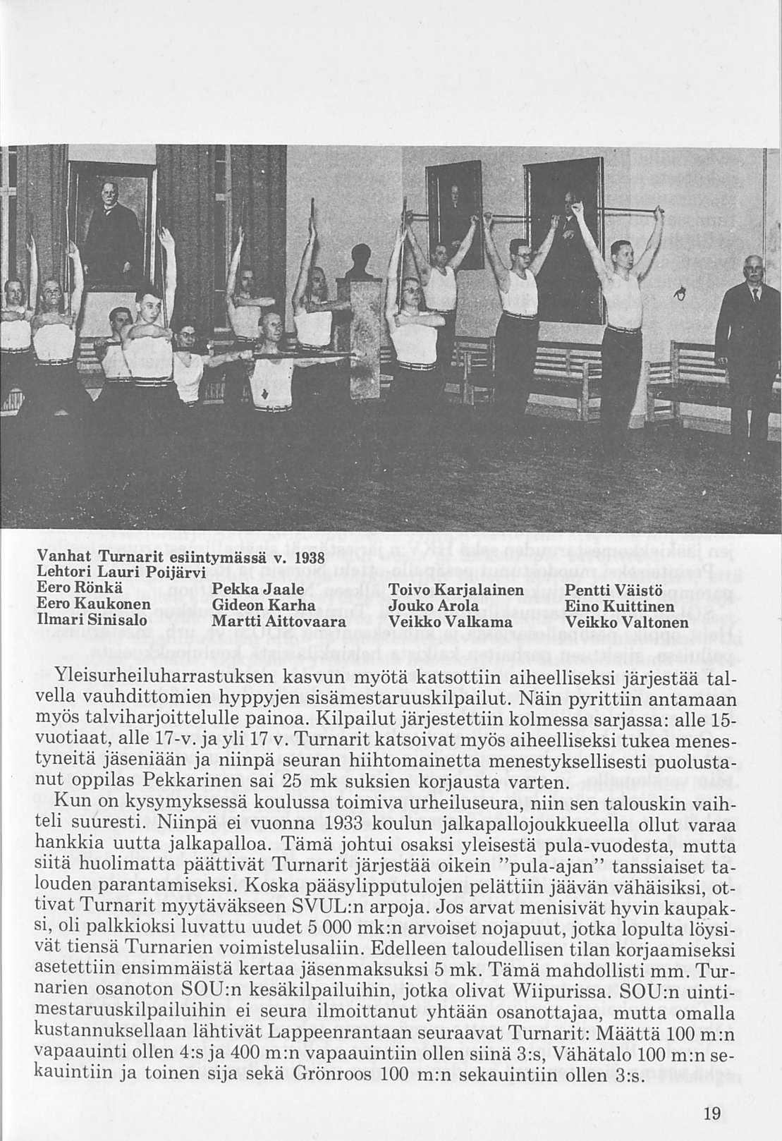 Voimistelijoiden taitojen karttuessa päättivät Turnarit järjestää voimistelunäytöksen, josta saaduilla varoilla hankittiin uudet nojapuut. Edelleen seuran taloutta kohentaakseen alkoivat Turnarit kantaa ns. sisäänkirjoittautumismaksua, joka perittiin jokaiselta vanhalta ja seuraan liittyvältä uudelta jäseneltä. Maksun suuruus oli 5 mk.