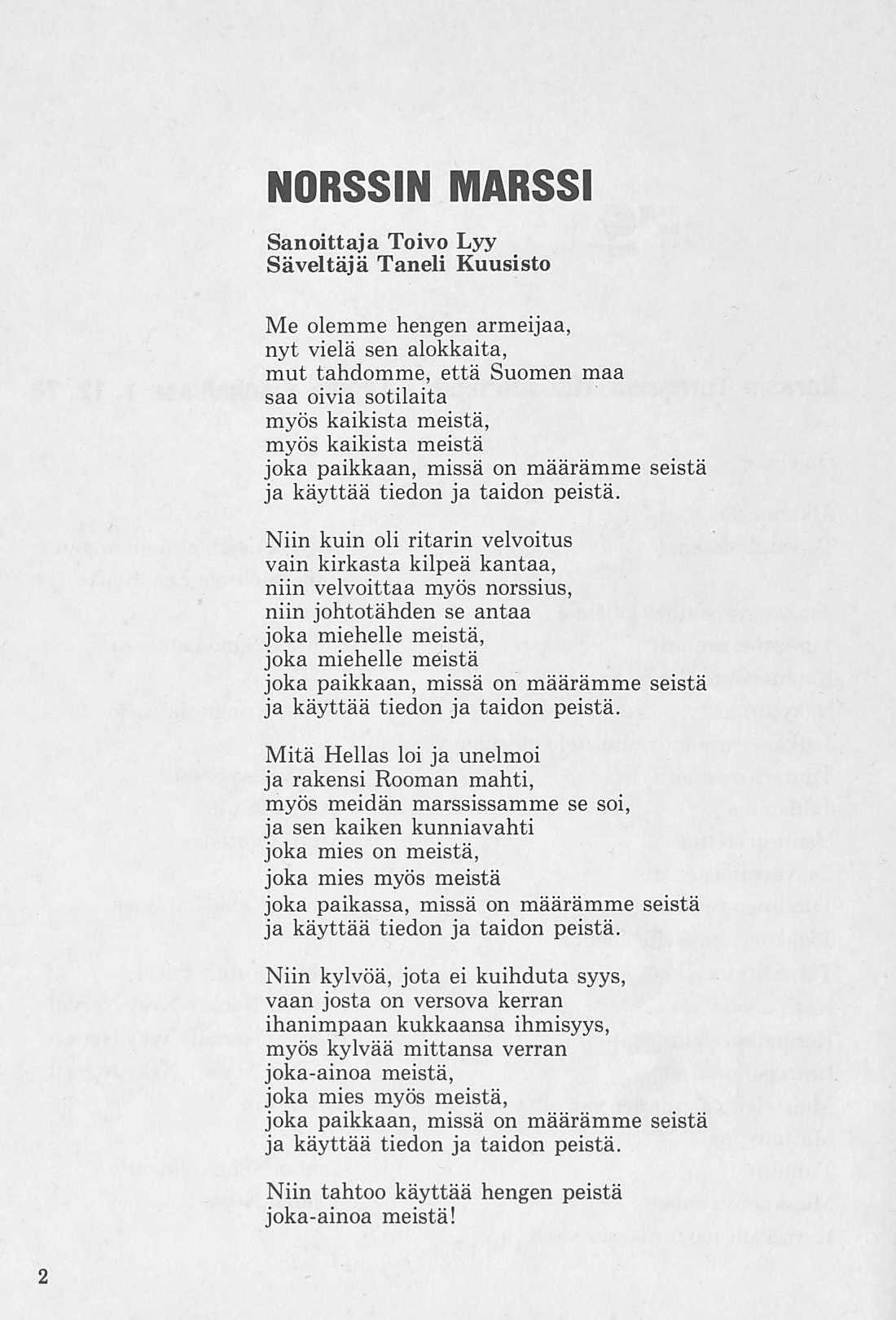 Niin kuin oli ritarin velvoitus vain kirkasta kilpeä kantaa, niin velvoittaa myös norssius, niin johtotähden se antaa joka miehelle meistä, joka miehelle meistä joka paikkaan, missä on määrämme seistä ja käyttää tiedon ja taidon peistä.