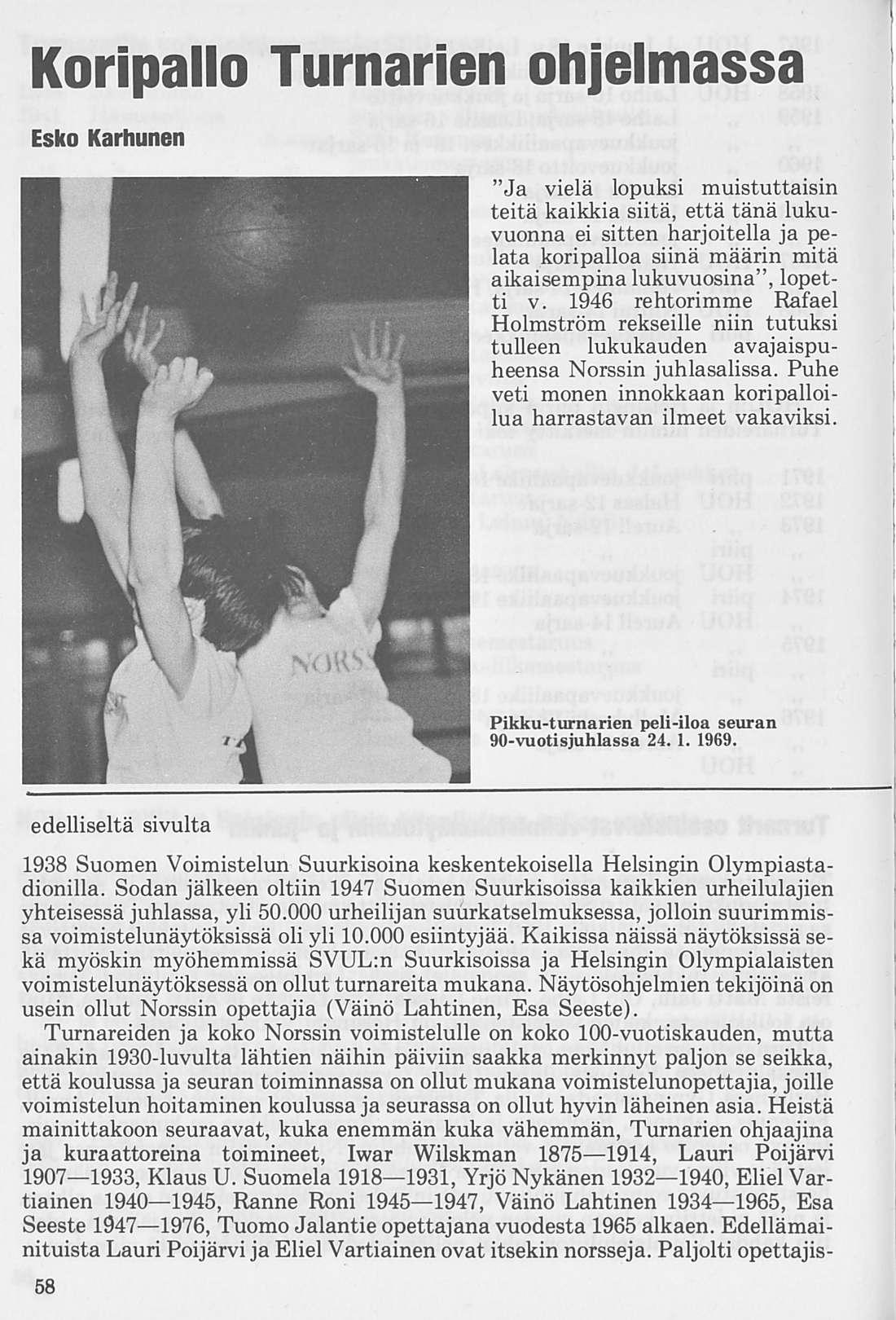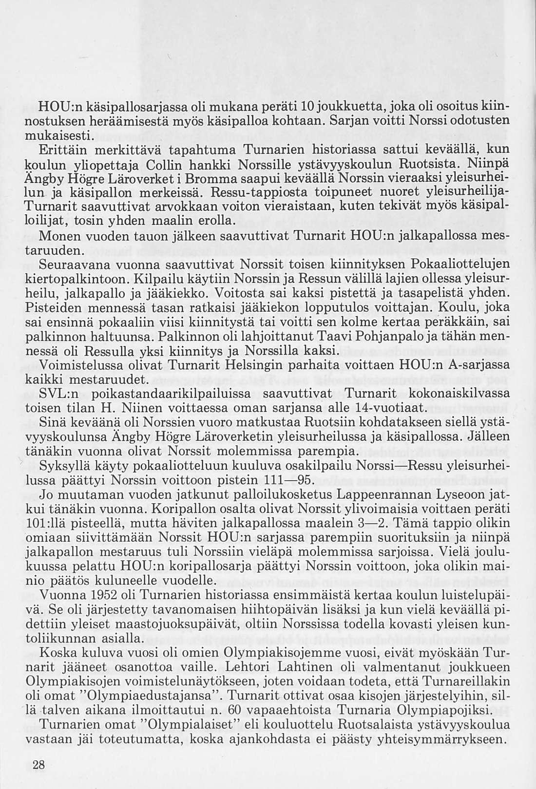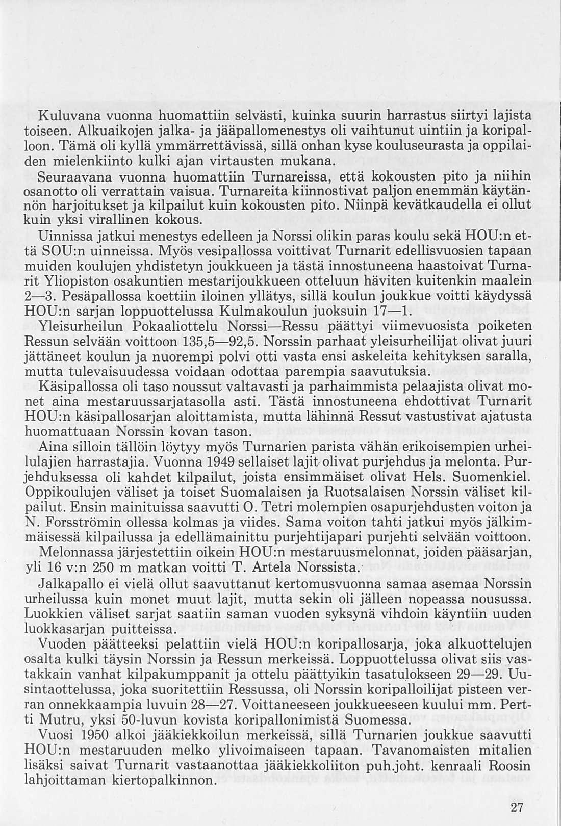 Turnarien alkuvuosien jääpalloilijoista kantoivat jo koulupoikina maajoukkuepaitaa mm. Esko Pekonen ja Erkki Ahlroth. Norssin palloilijat siirtyivät tavallisimmin HJK:hon tai Jukolan Poikiin, samalla tavoin kuin yleisurheilijat pitivät HKV:tä koulun seurana. Myöhemmin liittyivät seuran ohjelmaan muutkin palloilumuodot kuten pesä-, kori-, lento-, jakäsipallo sekä jääkiekko, ja edelleen uinti ja ammunta.