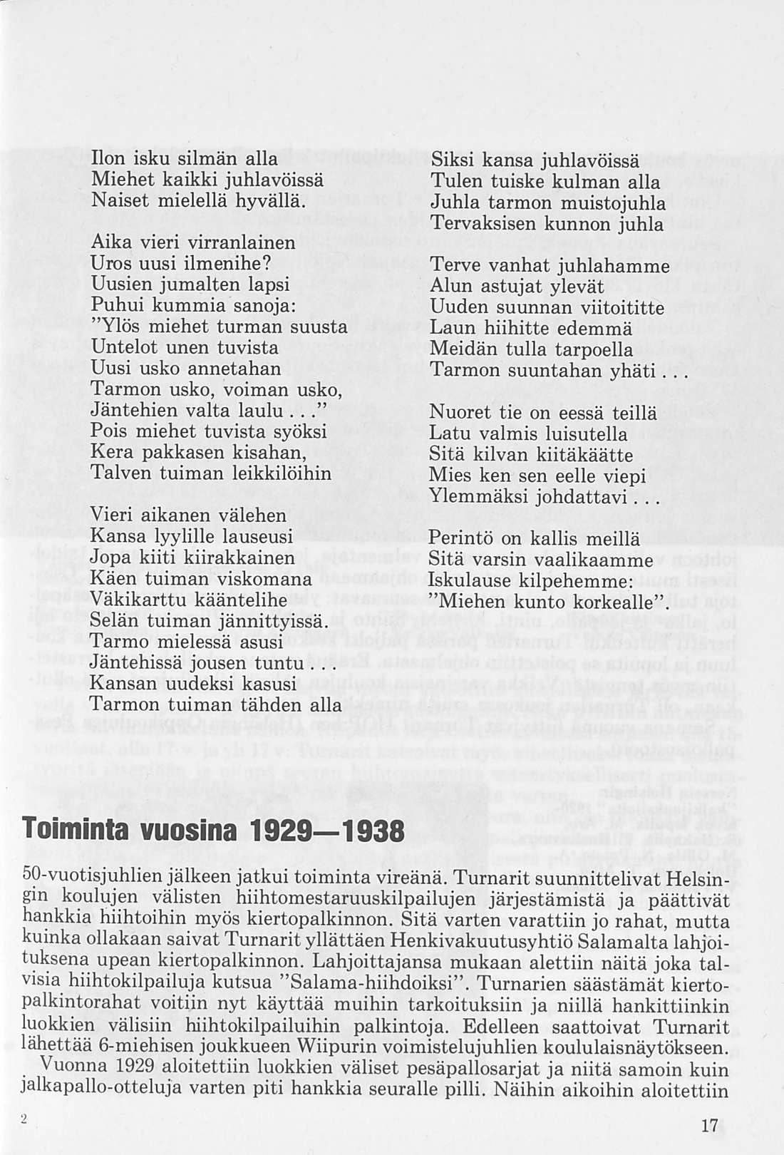 Illan kuluessa ojensivat Turnarit seuransa entiselle, innokkaalle johtajalle, lehtori Iwar Wilskmanille komean uushopeisen maljan, johon oli kaiverrettu sanat: "Lehtori Iwar Wilskmanille 30-vuotisjuhlan johdosta Turnareilta.”