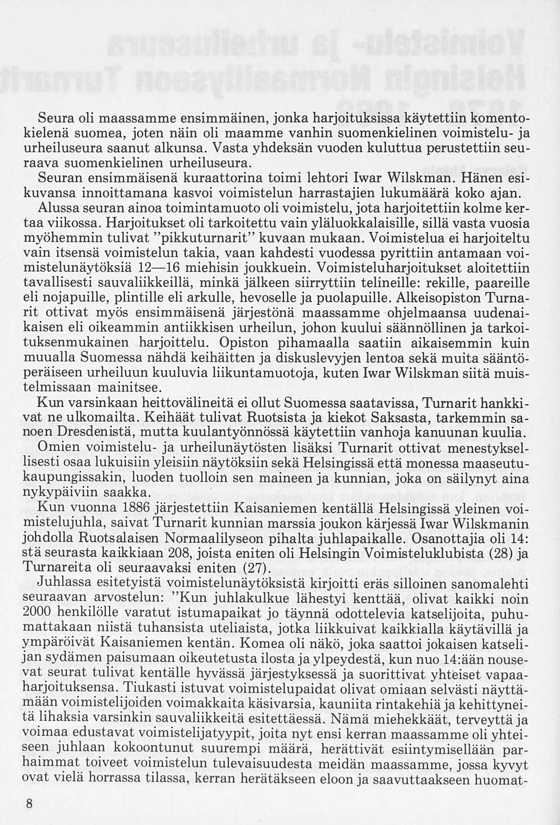 Kun vuonna 1886 järjestettiin Kaisaniemen kentällä Helsingissä yleinen voimistelujuhla, saivat Turnarit kunnian marssia joukonkärjessä Iwar Wilskmanin johdolla Ruotsalaisen Normaalilyseon pihalta juhlapaikalle. Osanottajia oli 14: stä seurasta kaikkiaan 208, joista eniten oli Helsingin Voimisteluklubista (28) ja Turnareita oli seuraavaksi eniten (27).