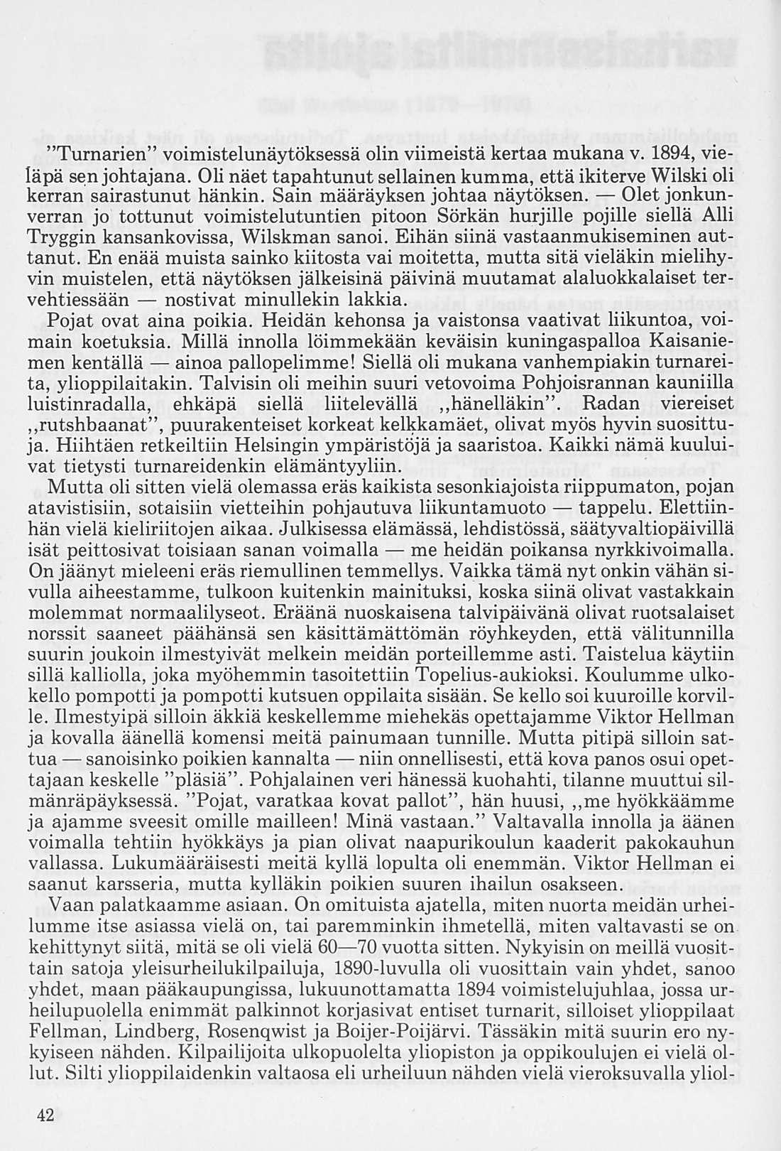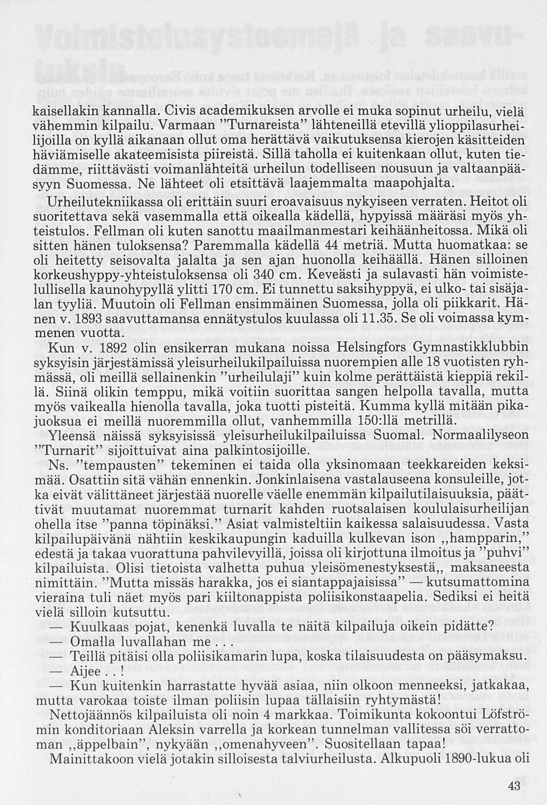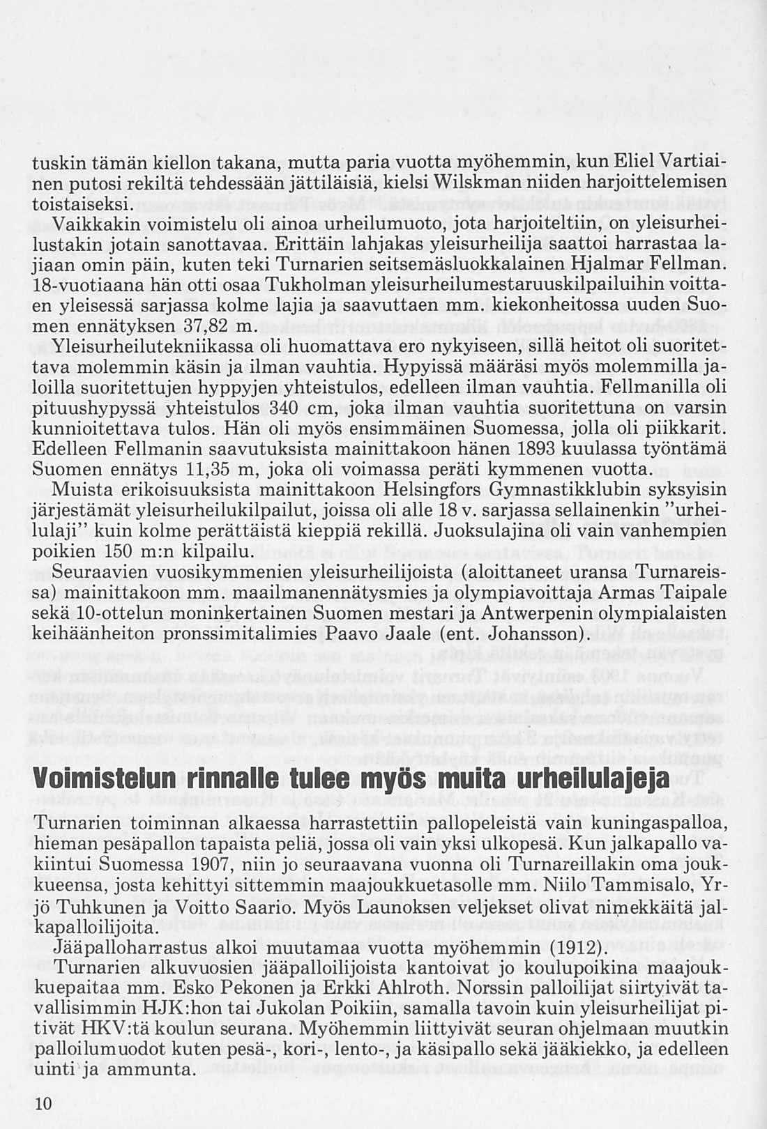 Vaikkakin voimistelu oli ainoa urheilumuoto, jota harjoiteltiin, on yleisurheilustakin jotain sanottavaa. Erittäin lahjakas yleisurheilija saattoi harrastaa lajiaan omin päin, kuten teki Turnarien seitsemäsluokkalainen Hjalmar Fellman. 18-vuotiaana hän otti osaa Tukholman yleisurheilumestaruuskilpailuihin voittaen yleisessä sarjassa kolme lajia ja saavuttaen mm. kiekonheitossa uuden Suomen ennätyksen 37,82 m.