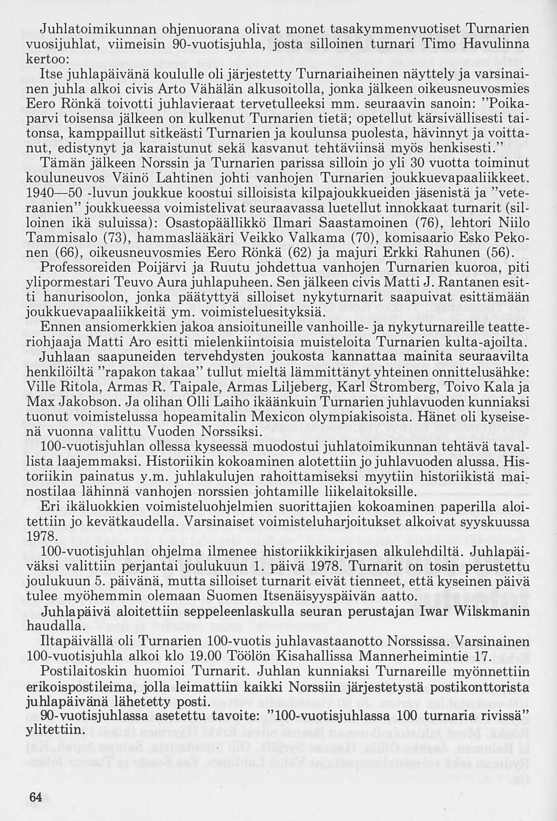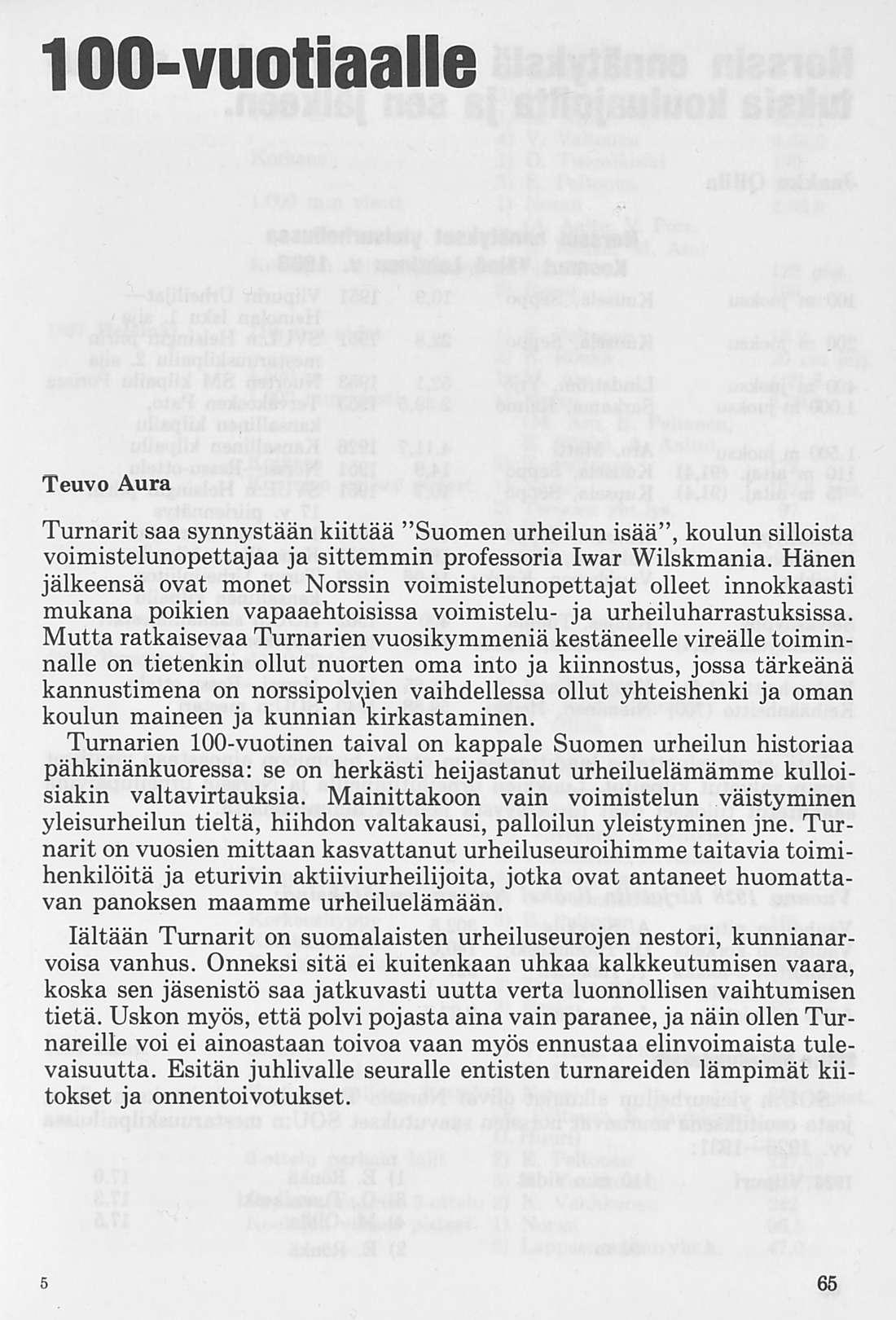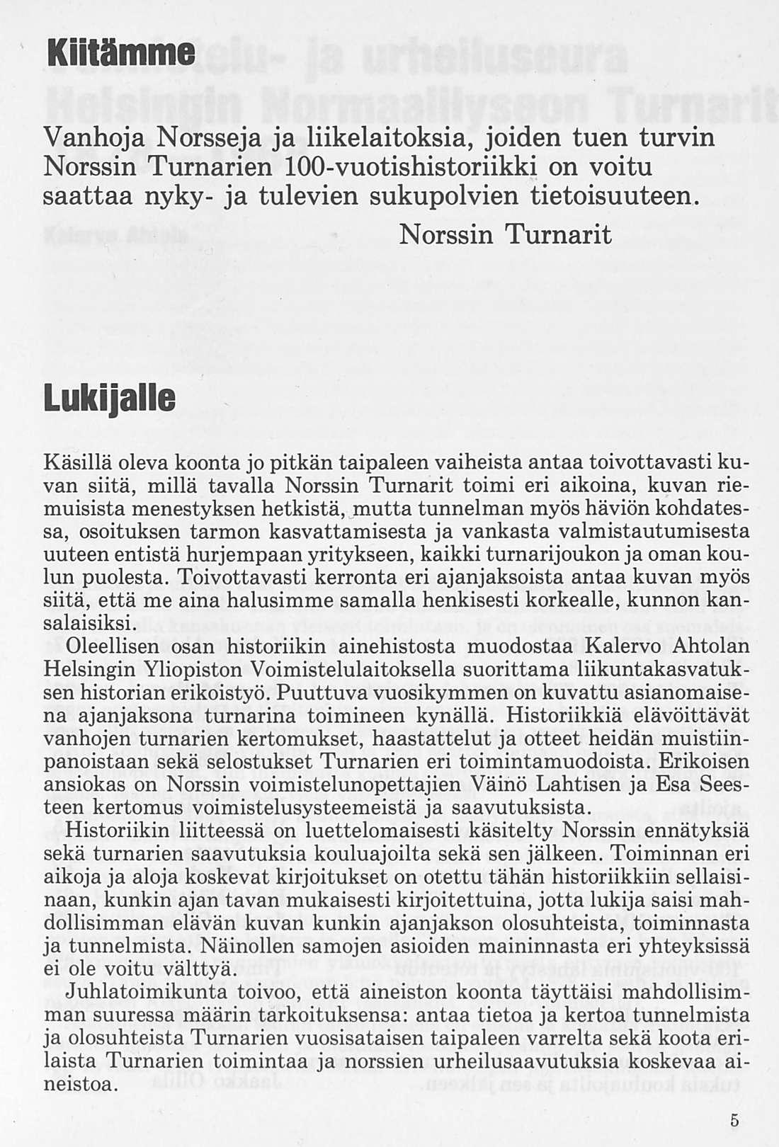 Juhlatoimikunta toivoo, että aineiston koonta täyttäisi mahdollisimman suuressa määrin tarkoituksensa: antaa tietoa ja kertoa tunnelmista ja olosuhteista Turnarien vuosisataisen taipaleen varrelta sekä koota erilaista Turnarien toimintaa ja norssien urheilusaavutuksia koskevaa aineistoa.