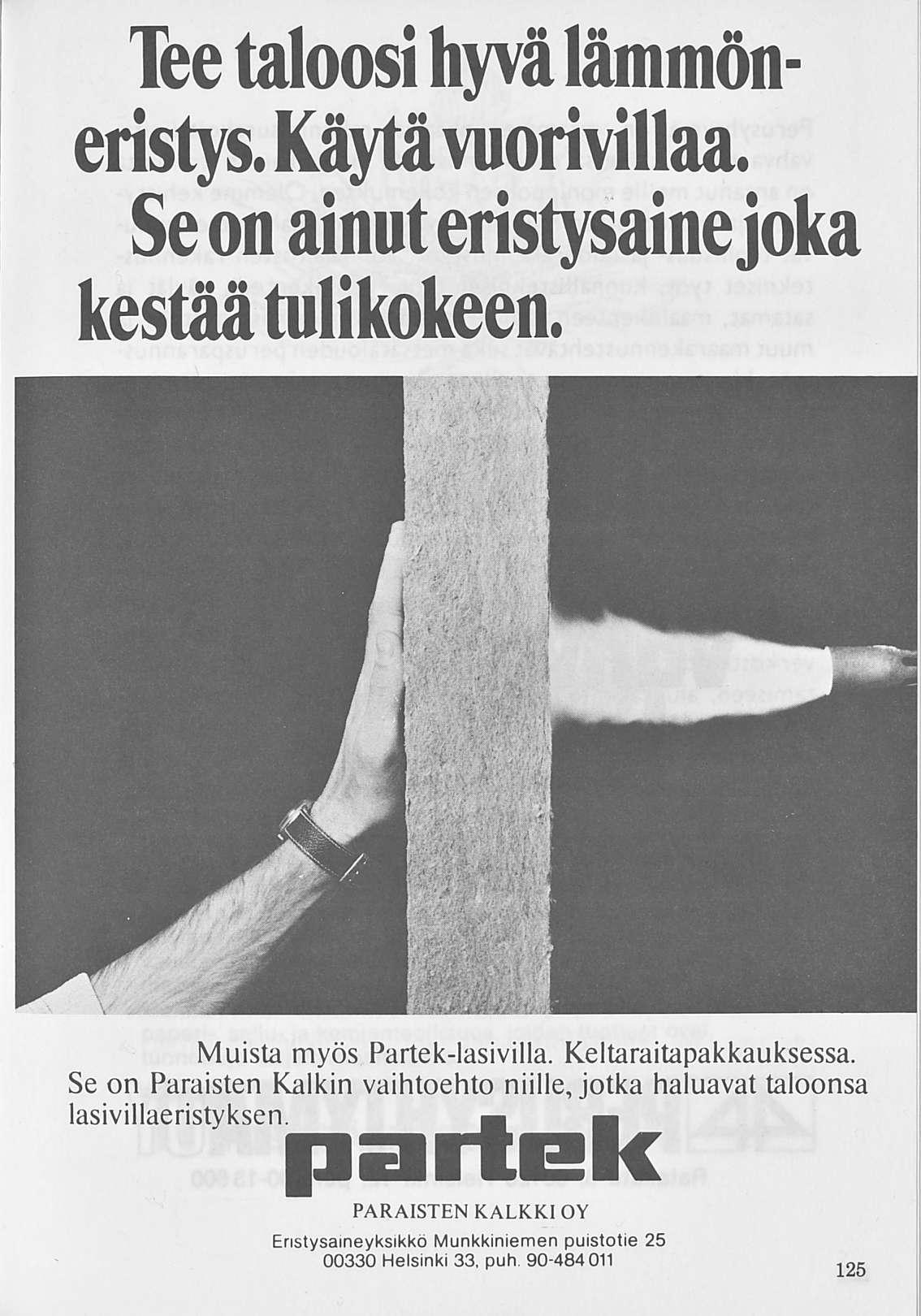 Muista myös Partek-lasivilla. Keltaraitapakkauksessa. Se on Paraisten Kalkin vaihtoehto niille, jotka haluavat taloonsa