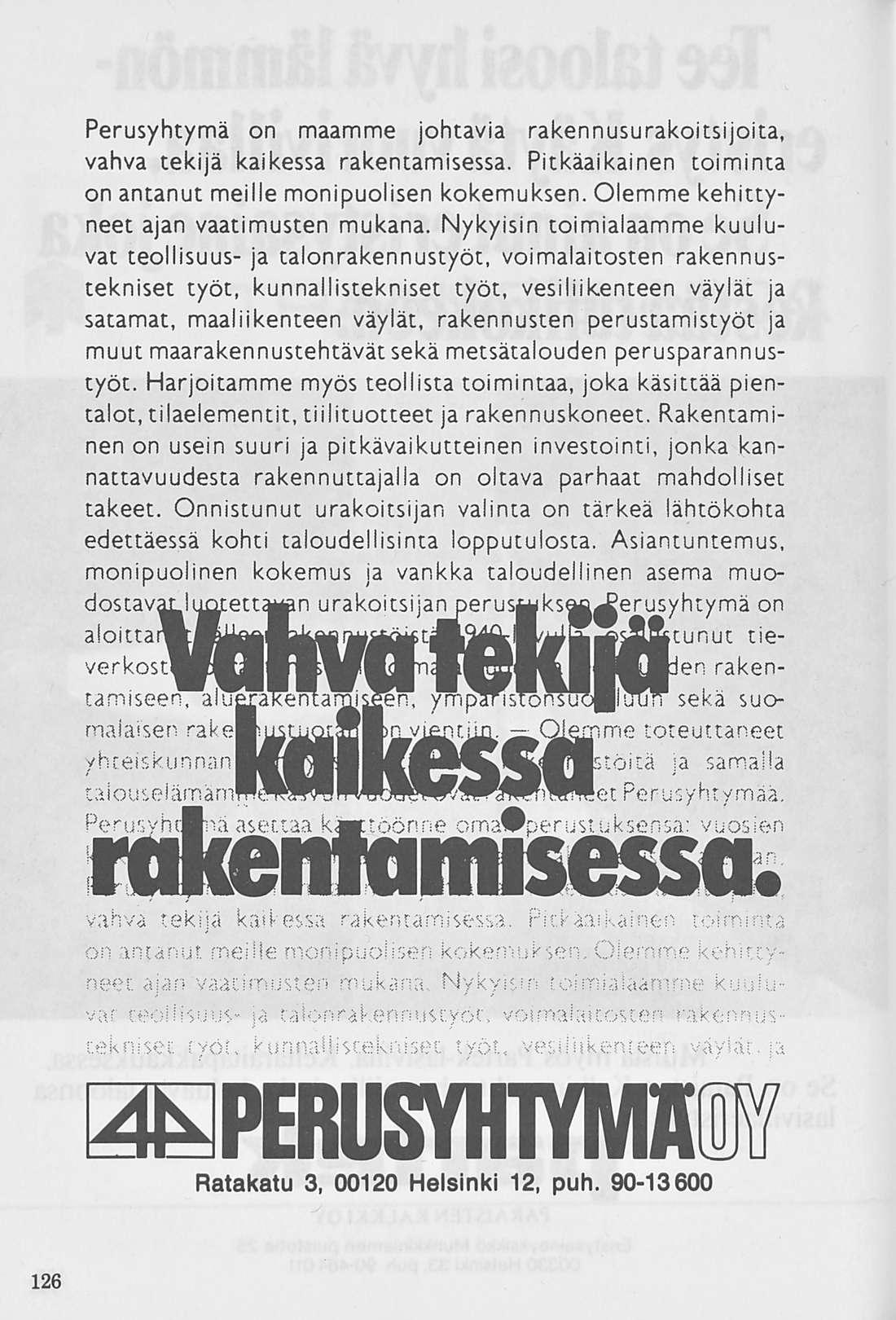 Perusyhtymä on maamme johtavia rakennusurakoitsijoita, vahva tekijä kaikessa rakentamisessa. Pitkäaikainen toiminta on antanut meille monipuolisen kokemuksen. Olemme kehittyneet ajan vaatimusten mukana. Nykyisin toimialaamme kuuluvat teollisuus- ja talonrakennustyöt, voimalaitosten rakennustekniset työt, kunnallistekniset työt, vesiliikenteen väylät ja satamat, maaliikenteen väylät, rakennusten perustamistyöt ja muut maarakennustehtävätsekä metsätalouden perusparannustyöt. Harjoitamme myös teollista toimintaa, joka käsittää pientalot, tilaelementit, tiilituotteet ja rakennuskoneet. Rakentaminen on usein suuri ja pitkävaikutteinen investointi, jonka kannattavuudesta rakennuttajalla on oltava parhaat mahdolliset takeet. Onnistunut urakoitsijan valinta on tärkeä lähtökohta edettäessä kohti taloudellisinta lopputulosta. Asiantuntemus, monipuolinen kokemus ja vankka taloudellinen asema muodostav.