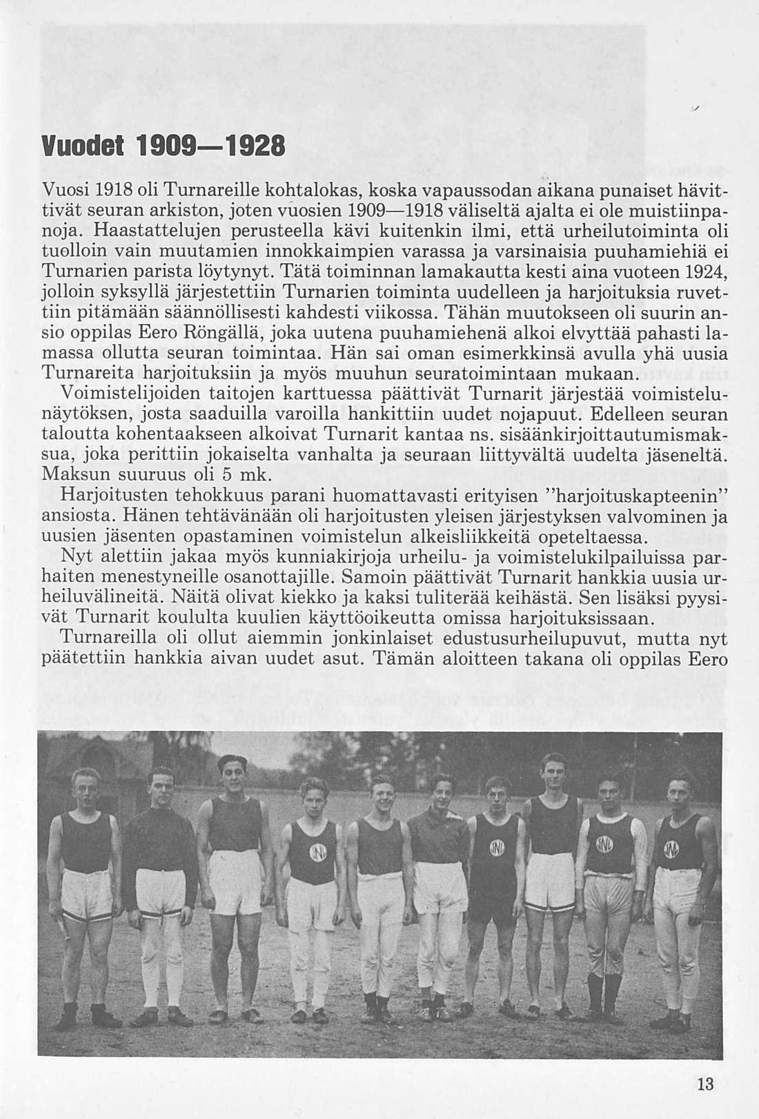 Vuosi 1918 oli Turnareille kohtalokas, koska vapaussodan aikana punaiset hävittivät seuran arkiston, joten vuosien 1909—1918 väliseltä ajalta ei ole muistiinpanoja. Haastattelujen perusteella kävi kuitenkin ilmi, että urheilutoiminta oli tuolloin vain muutamien innokkaimpien varassa ja varsinaisia puuhamiehiä ei Turnarien parista löytynyt. Tätä toiminnan lamakautta kesti aina vuoteen 1924, jolloin syksyllä järjestettiin Turnarien toiminta uudelleen ja harjoituksia ruvettiin pitämään säännöllisesti kahdesti viikossa. Tähän muutokseen oli suurin ansio oppilas Eero Röngällä, joka uutena puuhamiehenä alkoi elvyttää pahasti lamassa ollutta seuran toimintaa. Hän sai oman esimerkkinsä avulla yhä uusia Turnareita harjoituksiin ja myös muuhun seuratoimintaan mukaan.