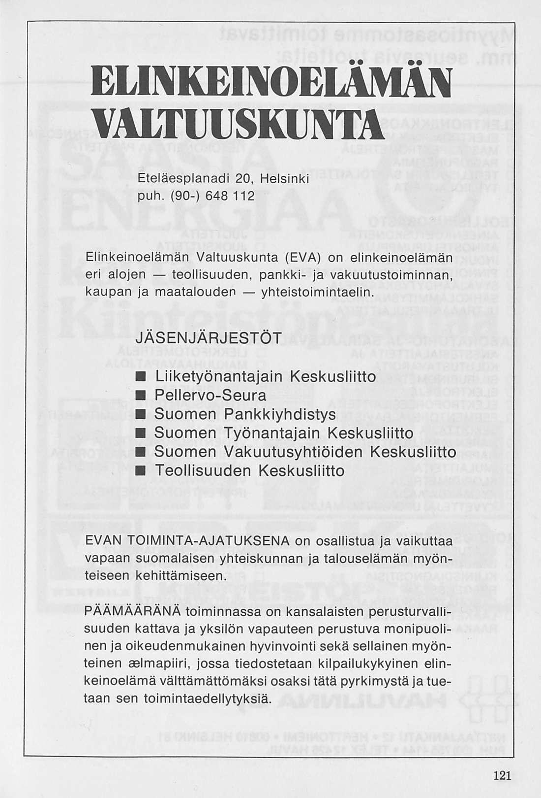 EVAN TOIMINTA-AJATUKSENA on osallistua ja vaikuttaa vapaan suomalaisen yhteiskunnan ja talouselämän myönteiseen kehittämiseen.