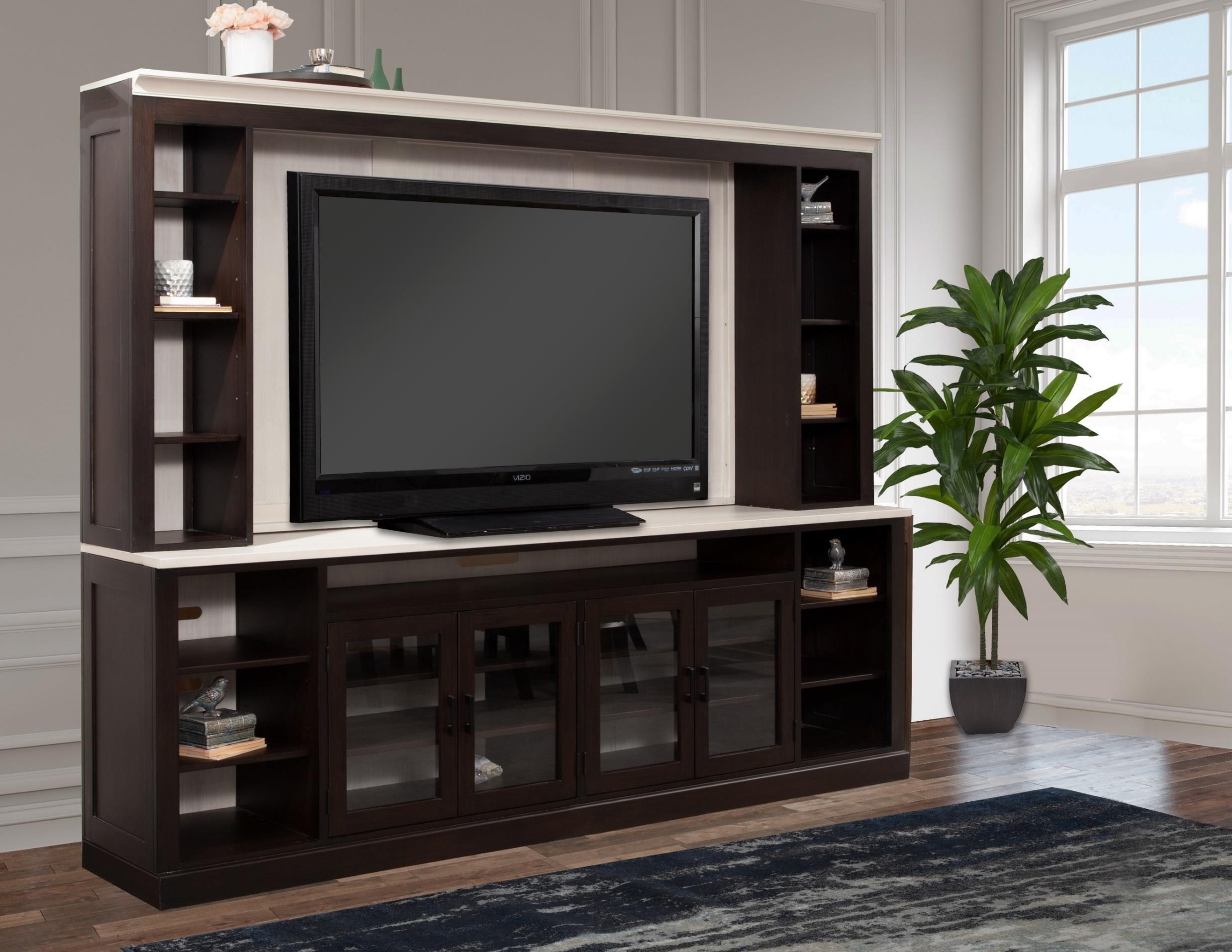 • 1264: 64" W Console with 2 glass doors, 2 wood/mesh option doors, an open cubby, and 2 drawers