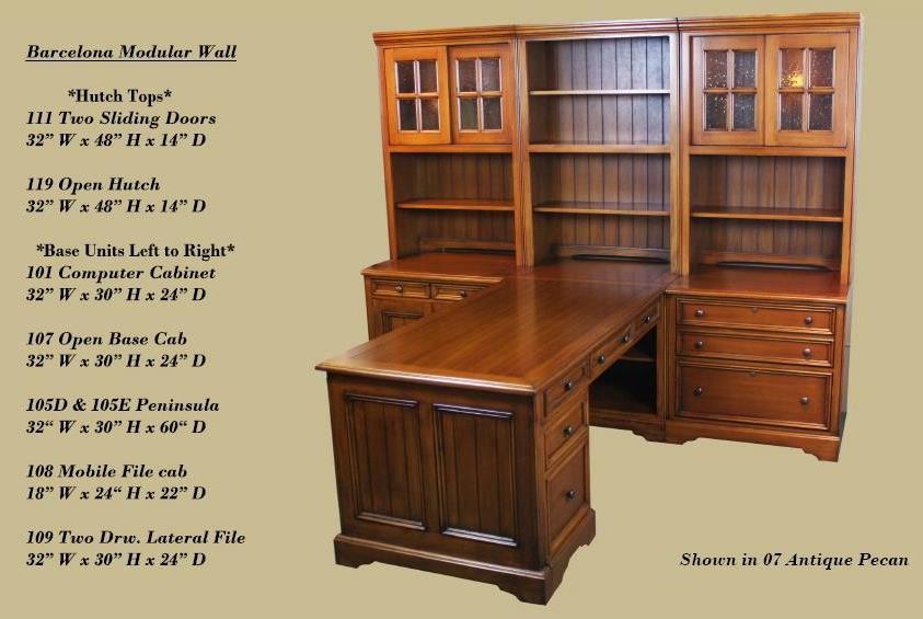 The 116 Hutch, measuring 66" wide, features beveled glass doors, open center cubbies, and built-in lighting, providing both storage and display space for your office essentials.