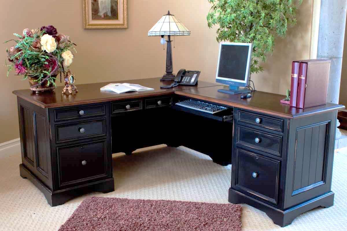 Double pedestal desk featuring file drawers at the bottom, two utility drawers, two pencil drawers, and a drop-down drawer.