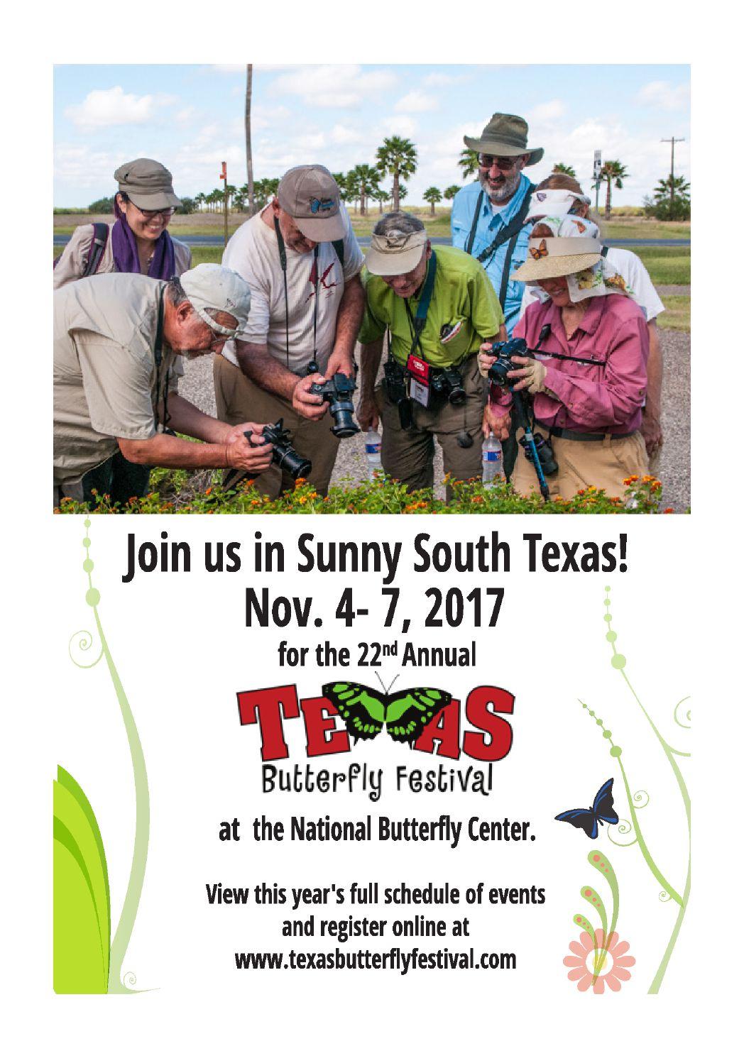 This year’s Texas Butterfly Festival will be held Nov. 4 - 7. Don’t miss the sensational butterflies, the amazing food, or camaraderie and good times! See the back cover of this issue for more information.