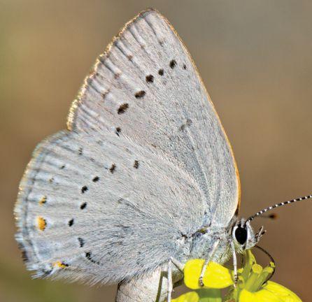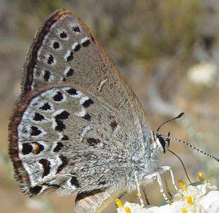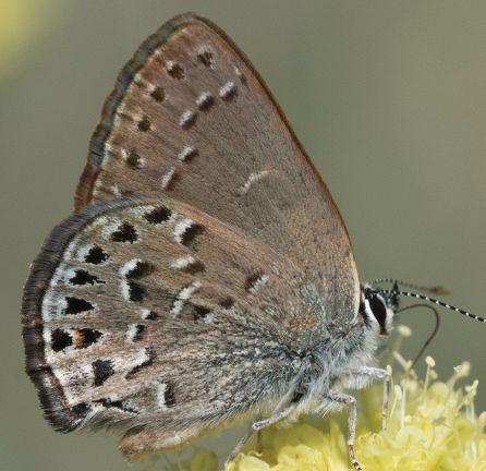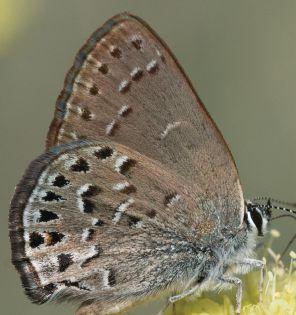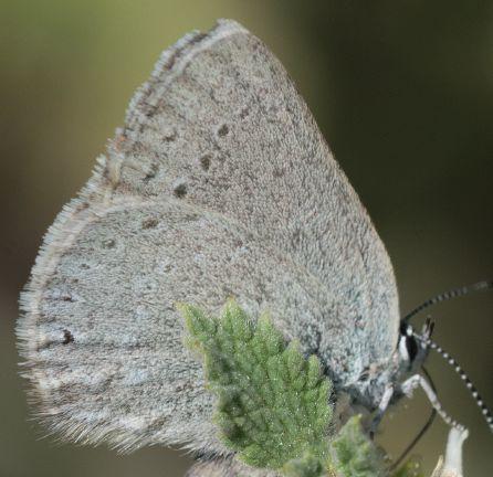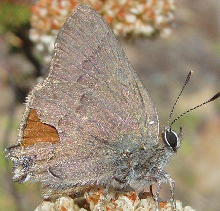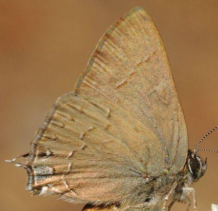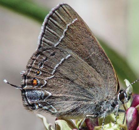 While Behr’s Hairstreaks are not likely to be confused with other Satyium hairstreaks, they can be confused with Mariposa Coppers. Mariposa Coppers (see photo 19) have a checked FW fringe, black spots in the FW cell and HW black basal spots that Behr’s Hairstreaks lack.