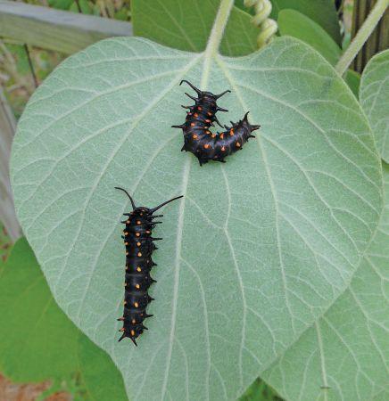On April 11, two small Pipevine Swallowtail caterpillars were found feeding together on Woolly Pipevine leaves on a garden trellis and the leaves were netted to protect the caterpillars from predation. The eggs were not found before the caterpillars were located but a photo of pipevine swallowtail eggs on the same plant taken another time is included for completeness.