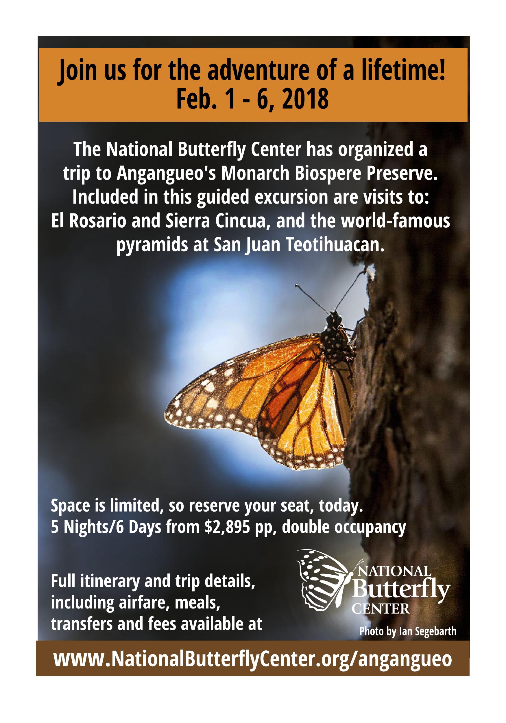 In February, 2018, NABA is offering, for the first time, a trip of a lifetime to see and learn about the spectacular Monarch overwintering sites in the mountains of central Mexico. For more information, see page 35 of this issue.