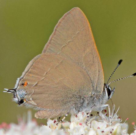 This distinctive Satyrium hairstreak is usually gray-toned, but some individuals can be brown (photo 16). The thick, black postmedian spots are more angular than on other Satyrium hairstreaks. Especially distinctive are the two contiguous spots that look (sort of) like black eyes with white eyebrows above them [A] Above, Behr’s Hairstreaks are bright orange. This can be seen when they saw their HWs or when they fly [B] (photos 16 and 20).