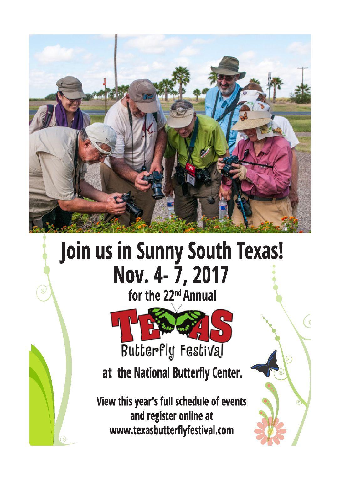 This year’s Texas Butterfly Festival will be held Nov. 4 - 7. Don’t miss the sensational butterflies, the amazing food, or camaraderie and good times! See the back cover of this issue for more information.