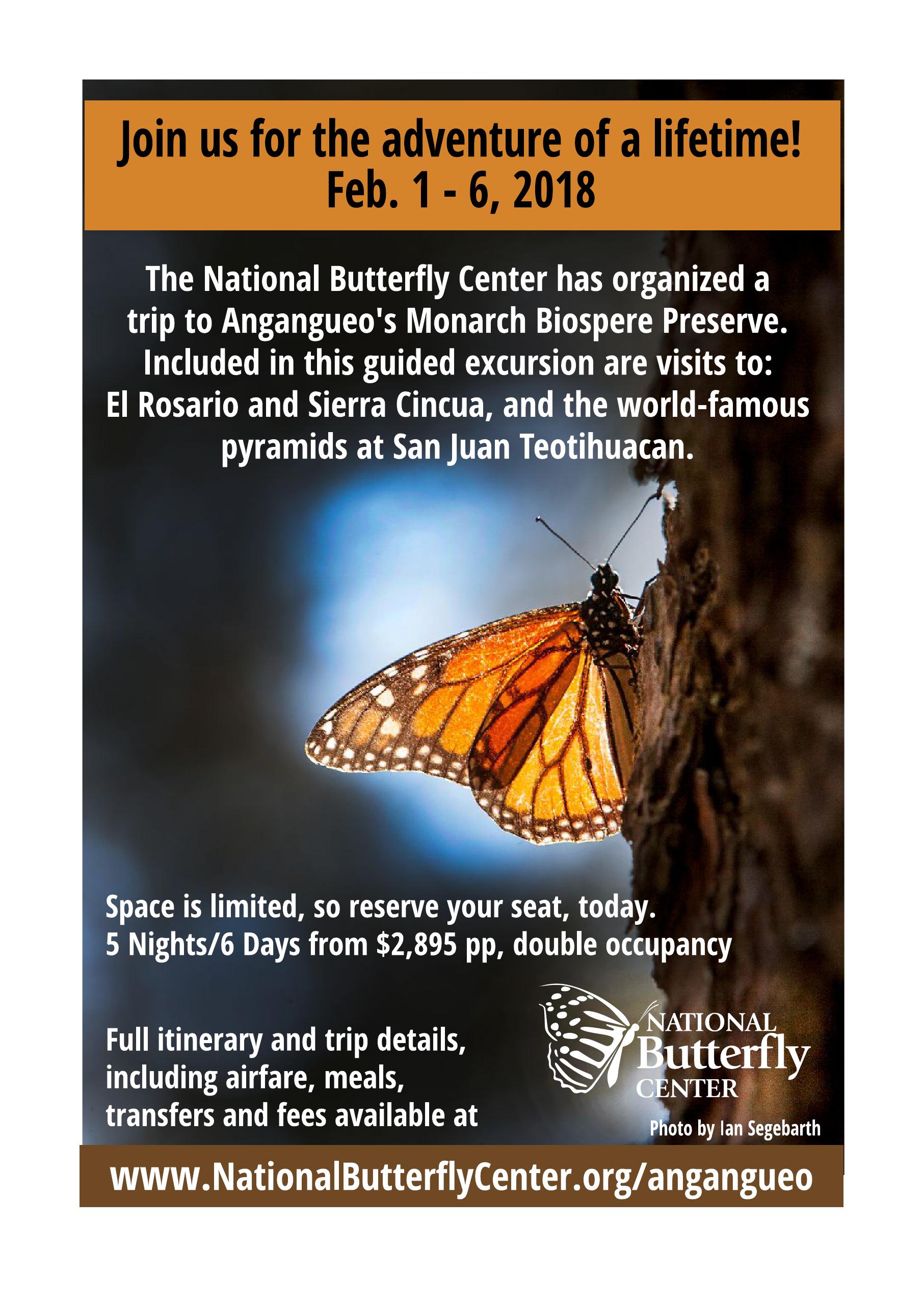 In February, 2018, NABA is offering, for the first time, a trip of a lifetime to see and learn about the spectacular Monarch overwintering sites in the mountains of central Mexico. For more information, see page 35 of this issue.