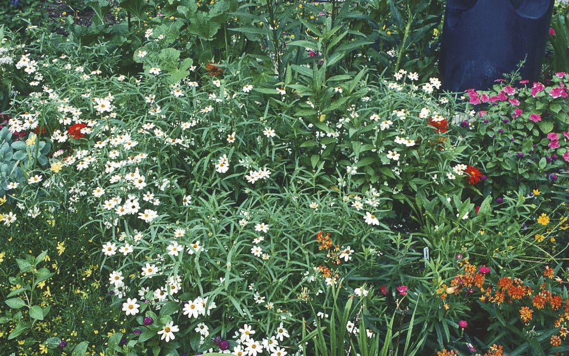 Photo lower right: A sidewalk bed featuring “Crystal Series,” a spreading/dwarf zinnia form. “Crystal White” and “Star Orange” forms are more prominent than “Star Gold.”