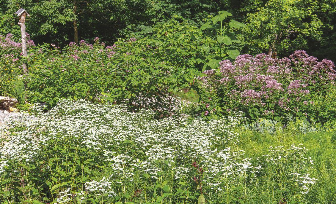 Native plants, of course! We gave the usual consideration to drainage patterns, number of sunlight hours, and height of plants. For the septic feld we only used native perennials, including Joe Pye Weed, asters, Eastern Purple Conefower, Orange Conefower, Purple Giant Hyssop, Wood Anemone, Tall Thimbleweed, Coreopsis, New York Ironweed, Blue Wild Indigo, Whorled Tickseed, and several shorter grasses and sedges. Because the roots of trees and shrubs could eventually interfere with the operation of the feld, they were not used near the septic-system components.