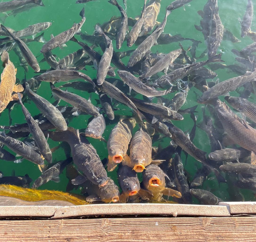 Access to the marina seemed a little strange, with a long dirt path to go to a rocky area where to park, then a long walk to find the marina itself. And... I stumbled on a bunch of carp right away! This is one of those marina spots where people keep hand feeding carp and they congregate. Oh, and a local guy sells pop-corn to feed them.