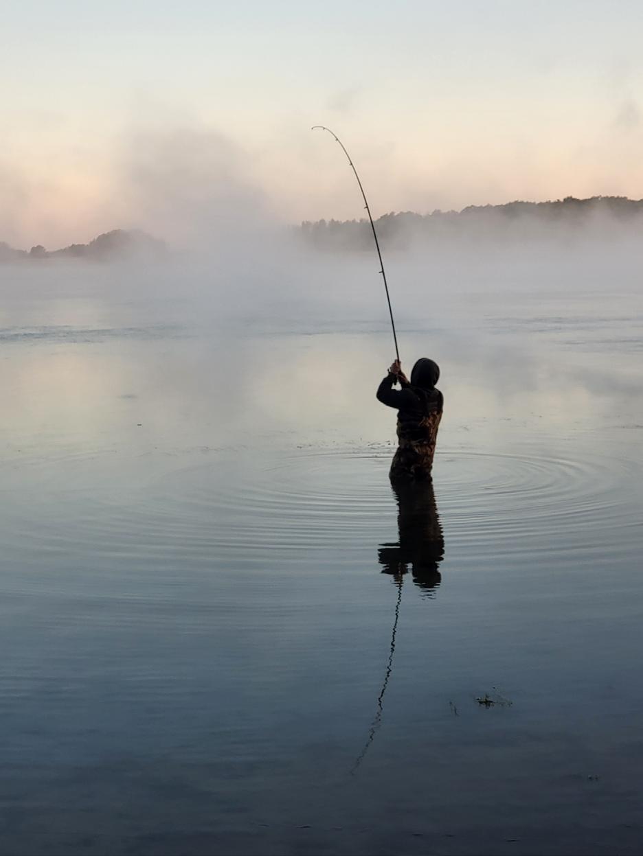 After a while, seeing a couple of jumps farther away, I repositioned a rod at 50 yards or so, while keeping one much closer to shore.