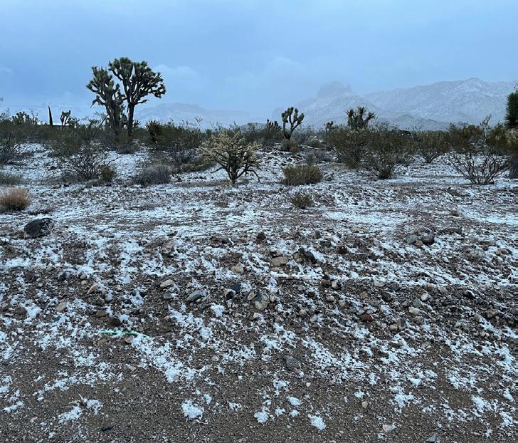 No boat ramp in sight, I turned around and I was relieved to make it back to the Meadview motel without a car incident. I decided to cut my stay short, as there was just no suitable place to fish, nor anything else to do! In the morning, I packed up, opened the room’s door and... what the heck? It snowed overnight in the desert?