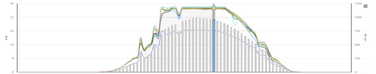 Wind loads can have a major impact on the electricity generated from a solar plant. This is specifically due to the wind stow mode designed to protect the solar racking and panels from damage caused by wind loading. Most single axis trackers have their wind stow mode set to an angle between 40 and 60 degrees. Depending on where the sun is positioned in the horizon, wind stow mode may significantly reduce the electricity generated during high winds. The drop can be especially dramatic when the sun shines on the opposite side from where the modules are facing during stow position.