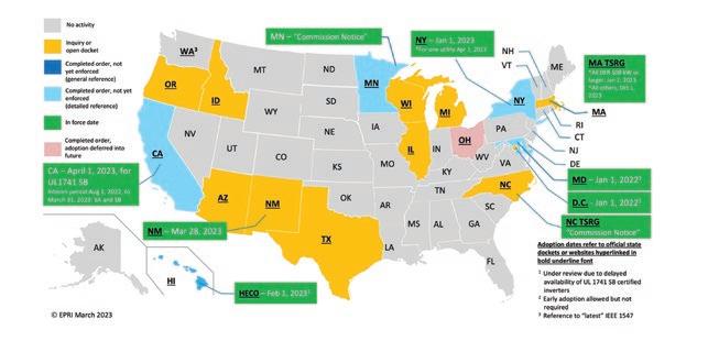which set into motion the U.S. states harmonizing around it as a requirement for any products or devices connected to the electric grid. As of March 2023, several states have adopted IEEE 1547. (Figure 3, IEEE Standard 1547-2018 – Status of Adoption across the U.S., presented by IEEE via EPRI) Additional states are anticipated to adopt this standard by the end of 2023. Compliance with the IEEE 1547 standard can be accomplished via UL test standard UL 1741. This is especially important for products and devices that “cross the bridge” between the DER and a substation, such as a feed-in controller. As state utility regulatory boards continue to harmonize around this standard, it is anticipated that more industry products will comply with the UL or similar thirdparty test standards.