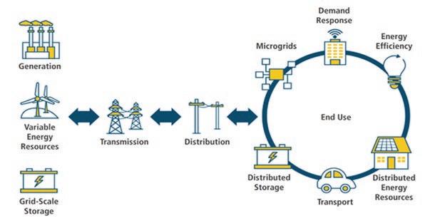 With the growth of renewable energy sources such as wind, solar, and storage, T&D evolved into a two-way grid, where generation plants—otherwise known as distributed energy resources (DERs)—became smaller and more prolific; power was both generated and consumed by users. This increased the complexity of the electric grid, requiring utilities to monitor a greater number of DERs. More importantly, it enabled communication with all of them to adjust power needs as required. (Figure 2: Two-way electric grid, Department of Energy, Office of Energy Policy and Systems Analysis, 2016)
