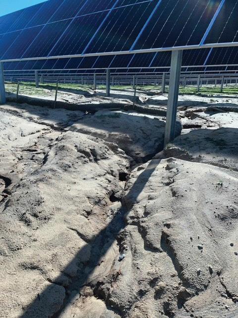 Sites that get substantial rains need good drainage. This can include drainage swales, recharge ponds, vegetation management, etc. At one site, costs were cut on a main road to lower the price in order to make the sale. Then, a heavy rain washed out the road and exposed direct burial medium voltage cables. This major erosion created a safety problem and high repair costs. In this case, the small initial “savings” turned out to be a fraction of the repairs required the first year. Additionally, the roadbed needed to be upgraded to what it would have been before those perceived savings. It’s best practice to always look at the risks and rewards for any cost cutting measures.