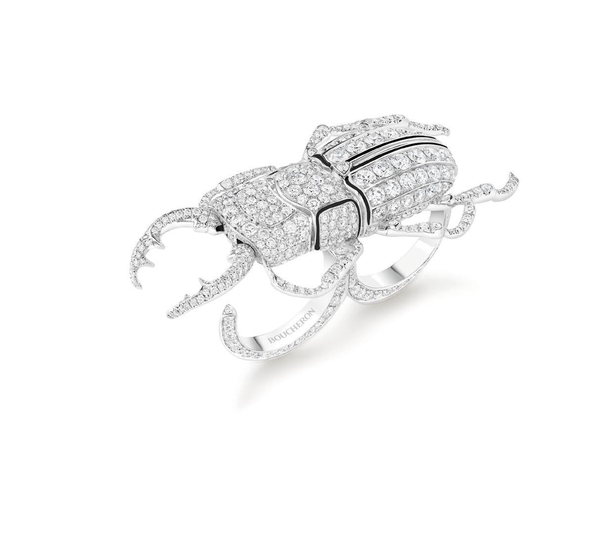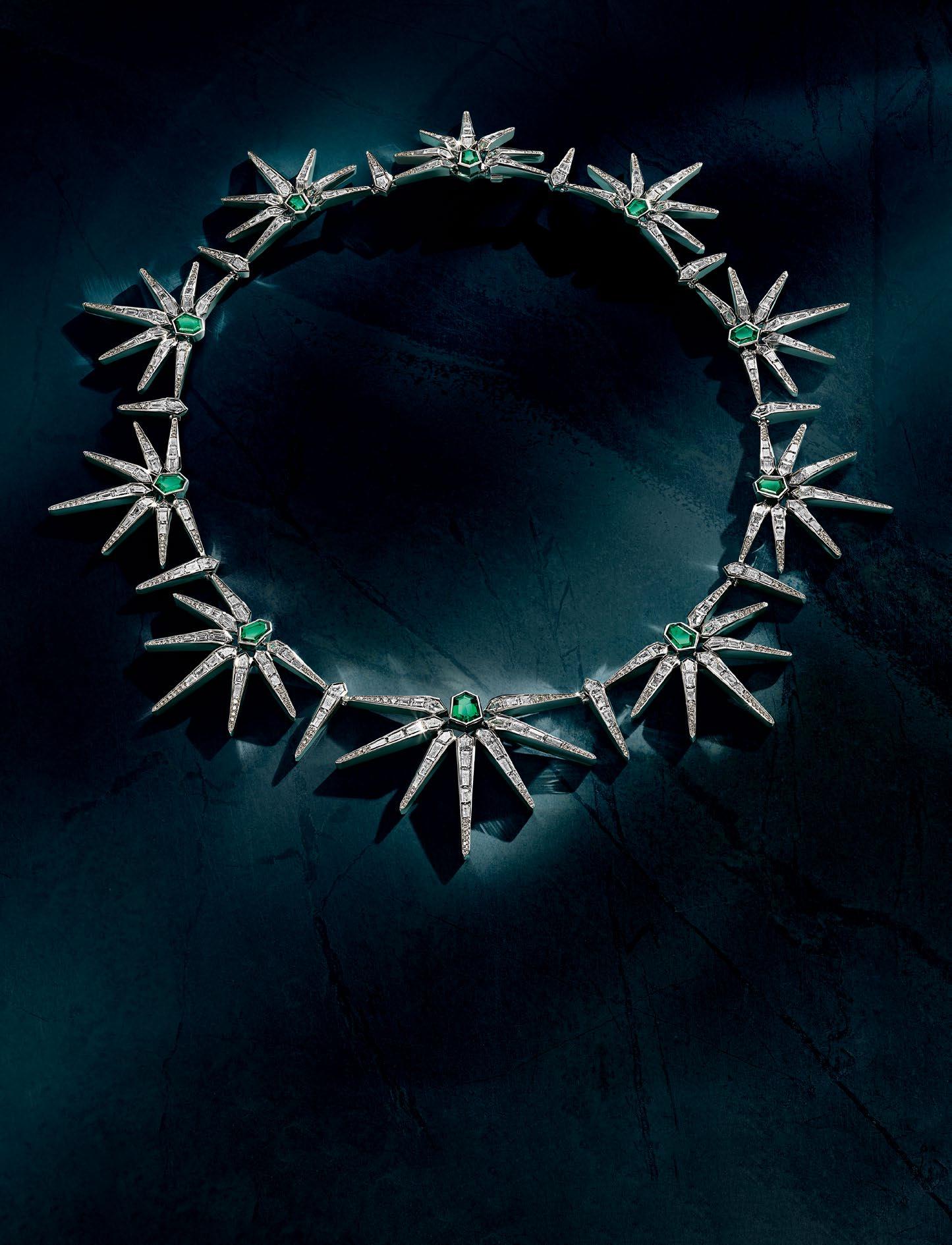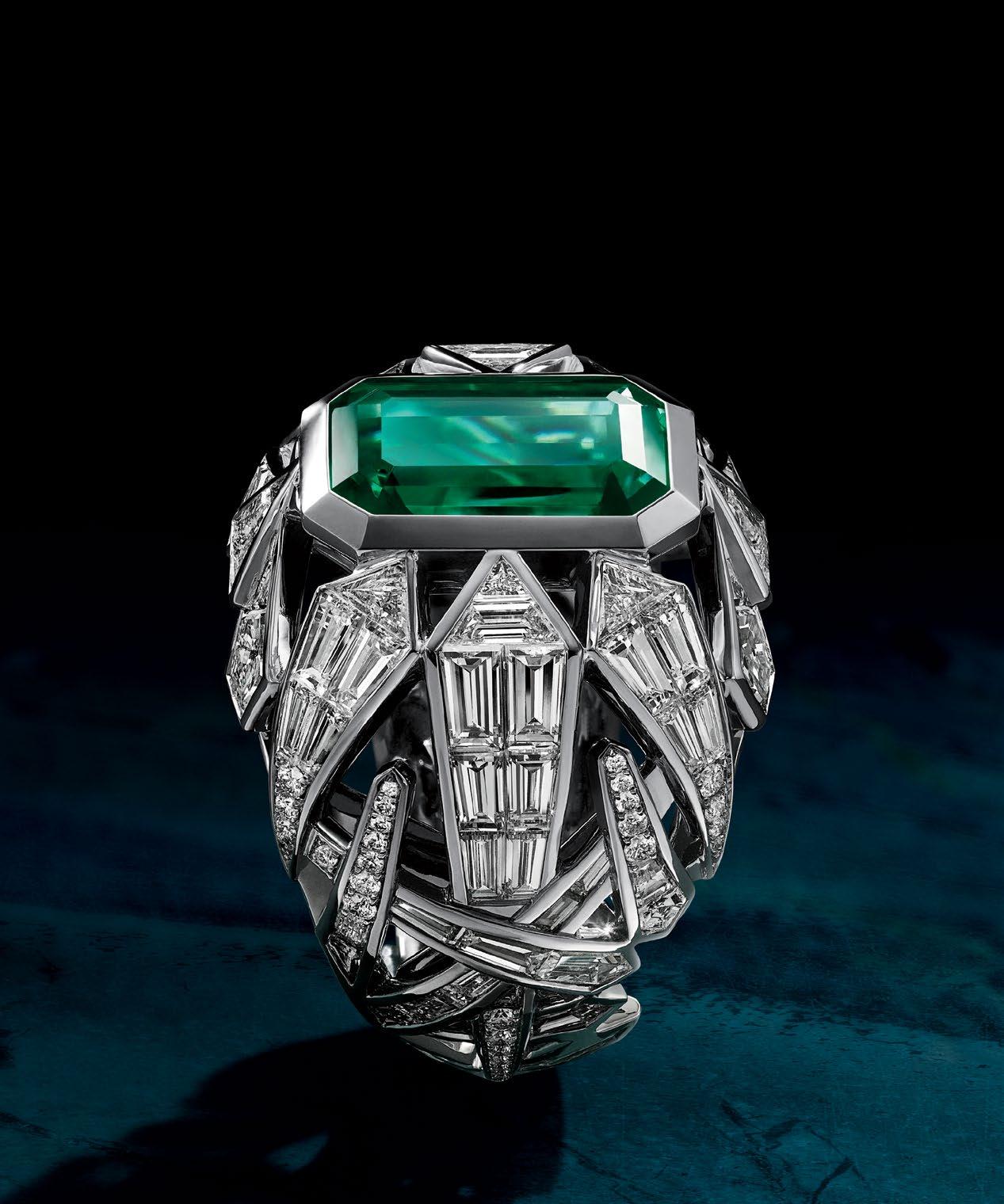 The Art of Hand-Cut Diamonds. Liberty ring in 18K white gold with a 6.08 carat faceted emerald, framed with 6.18 carats of custom-cut baguette and round brilliant diamonds. Opposite: Liberty necklace in 18K white gold with 5.50 carats of faceted emeralds and 26.50 carats of custom-cut baguette and round brilliant diamonds.