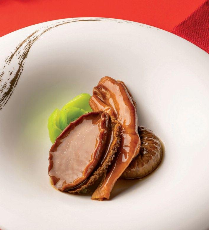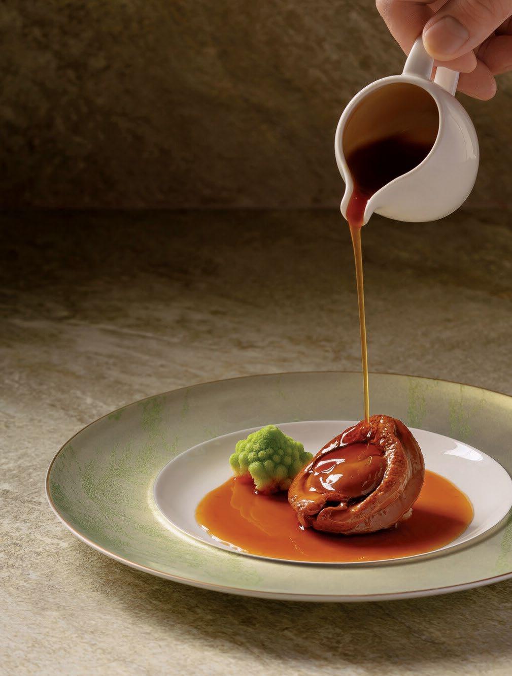 At the Cantonese restaurant Zhuo Yue Xuan at Four Seasons Hotel Shenzhen, abalone is prepared with goose feet and shiitake mushrooms, served with premium oyster sauce.