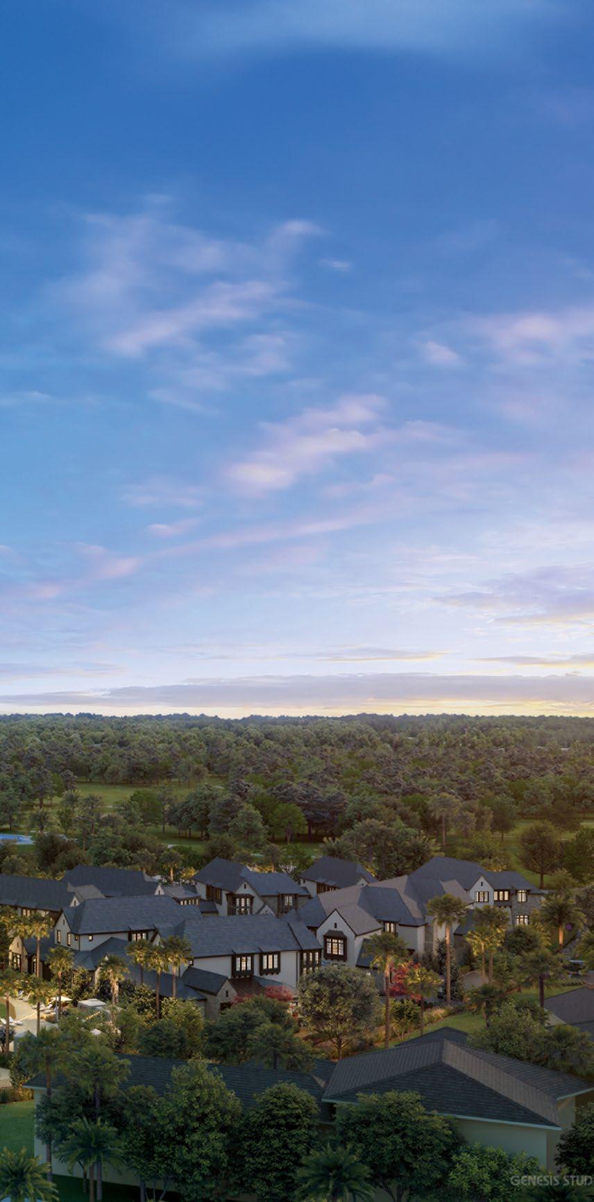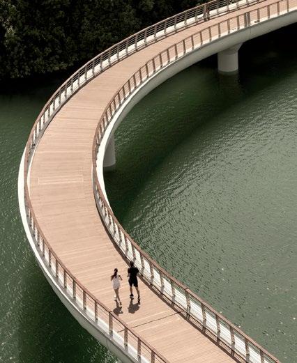 ON THE WATERFRONT An infinity pool 300 feet wide will overlook an especially beautiful bend in the lake. On the lakefront, residents will have access to the Lake Clubhouse, a private marina, and boat slips, as well as the property’s fully electric watercraft.