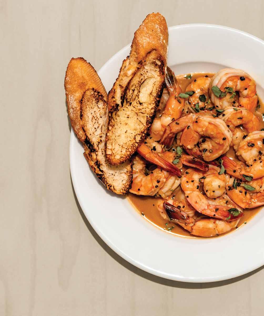 Pictured here: Tail-on shrimp sauteed in hot oil with garlic, white wine, hot sauce, Worcestershire, Cajun seasoning, butter, a generous helping of medium-ground black pepper and fresh oregano for garnish – served with slices of a grilled baguette to savor every last bite.