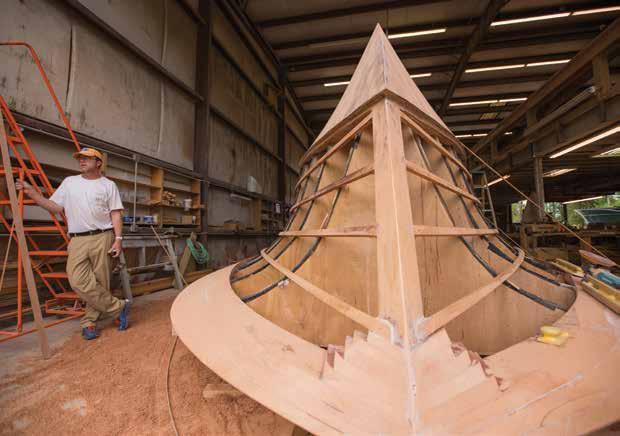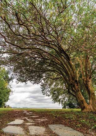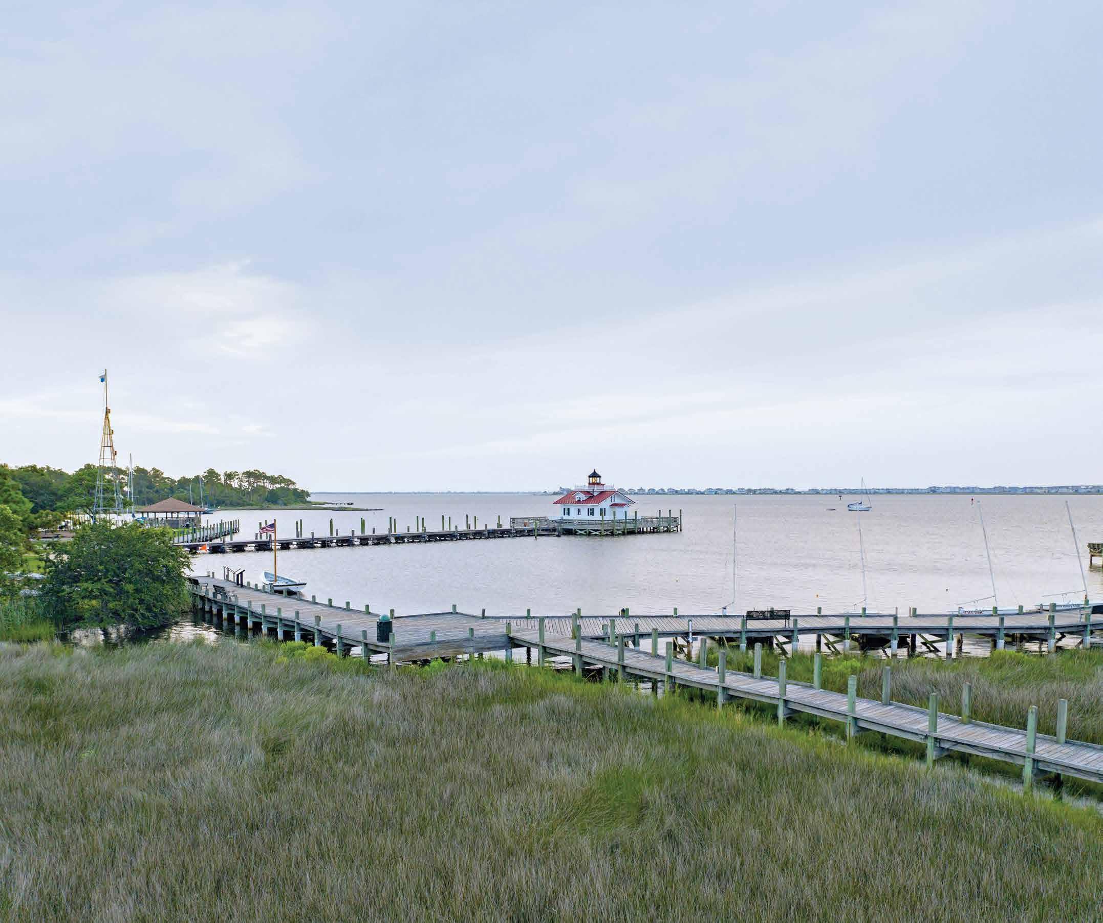 Pictured here, clockwise from top: Whether seen from above or inside, the Wright Brothers National Memorial casts a fascinating shadow on the Outer Banks landscape (Winter 2014, photo by Kati Wilkins). The North Carolina Department of Transportation’s official shipyard is an essential facility for inspecting and maintaining our state ferries –and it’s located right here in Manns Harbor. (Spring 2021, photo by Ryan Moser). In one of the most remote areas of Currituck County, majestic trees are shaped by the wind at the nearly 100-year-old Flyway Club on Knotts Island (Winter 2019, photo by Elizabeth Neal).