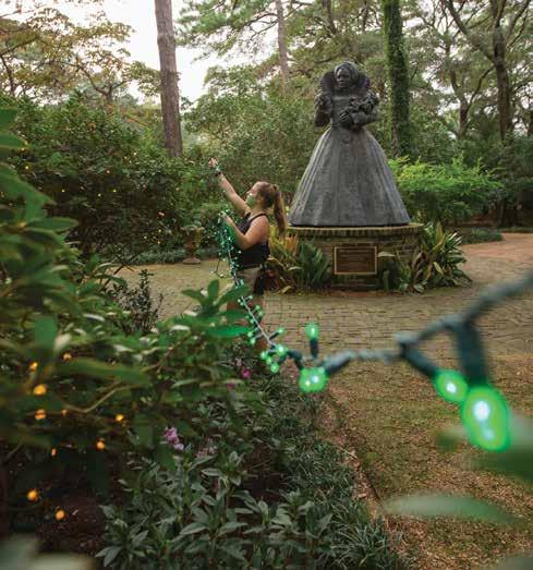Under the watchful eye of Queen Elizabeth I’s statue, staff readies The Elizabethan Gardens with a portion of the million-plus lights that make the site shine during its annual WinterLights extravaganza (Winter 2019, photo by Ryan Moser).