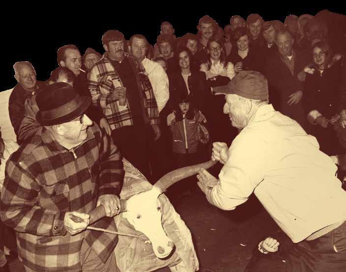 News of the edict didn’t reach the isolated islanders for some time, however, and was largely ignored even after it did. To this day, Old Christmas festivities are typically held at the Rodanthe-Waves-Salvo Community Center with plenty of food, music and dancing – plus the annual appearance of a legendary bull known as Old Buck. Played by costumed locals, his riotous arrival is the customary signal that it’s time to crank up the volume and get the party started. (Old Buck antics abound in 1973; photo courtesy of the Outer Banks History Center.)