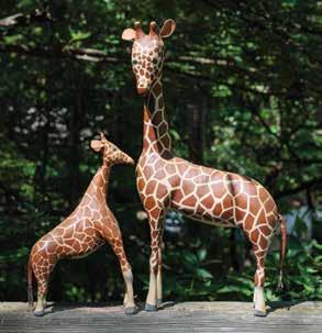 Clockwise from top: A teal duck decoy with a unique keel-shaped bottom that marks Vic’s handiwork; a mother and daughter set of giraffes that Ellen carved after her own mother passed away; and a preening anhinga that was chiseled out of cherry wood before being sanded to perfection.