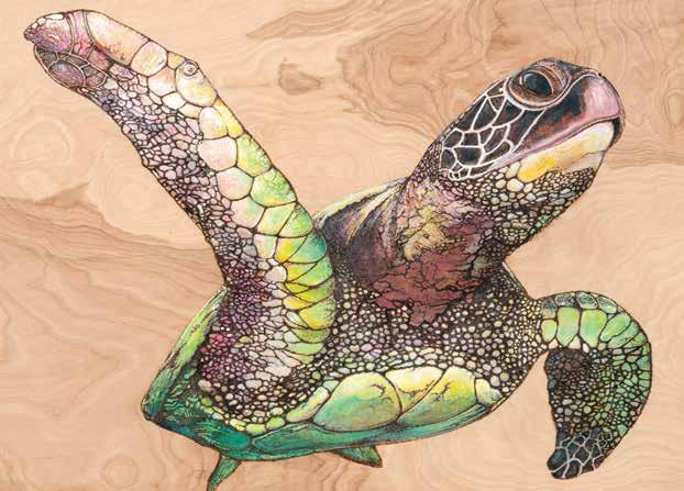 Adding vibrant colors as part of the finishing process is another thing he enjoys –though balancing that with giving a piece of wood the opportunity to speak for itself often means approaching each project differently. His sea turtle (pictured bottom, far right) is a perfect case in point. After fractally burning the area that became the turtle’s neck, Noah spent near-countless hours handetching each of the animal’s scales – which made the decision to maintain a simple wood-grain backdrop rather easy.