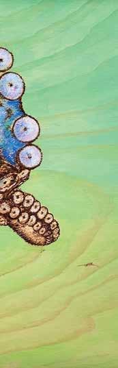 From top to bottom: Noah was given mostly free rein when it came to one of his first commissions of an octopus – though his client had a color scheme in mind, he was otherwise told to go for it in terms of execution, resulting in an eye-popping underwater image. The fluid fractal edges of this wave are the payoff from going with the grain. “That’s just the beauty of wood,” Noah notes. “You can really put it through the ringer.”