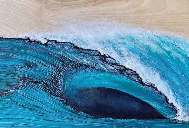 FLAMES SIZZLE THROUGH THE SURFACE of a wooden plank as Noah Snyder gently nudges an electrical current along a ridge that he’ll ultimately transform into the lip line of a wave. There’s a lot yet to be done before the piece will be complete – but this elemental first step is undeniably thrilling.