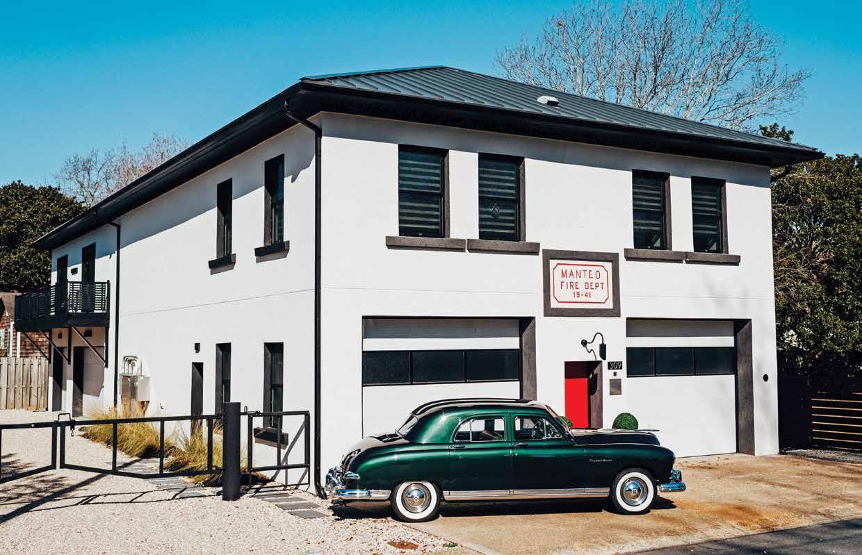 In keeping with their experience reviving antique automobiles, the couple repurposed as much material as possible from the station’s original building. The main exposed beam running through the upstairs loft is the same one that was installed in 1941. A collection of floating shelves, as well as the kitchen’s baker’s island and the garage’s wet bar, were crafted using wood taken from the station’s old attic rafters. They also restored the building’s exterior to mirror the original firehouse, forgoing the Tudor-style façade that was implemented in the early 1980s in favor of a fresh coat of white stucco and an understated hip roof.