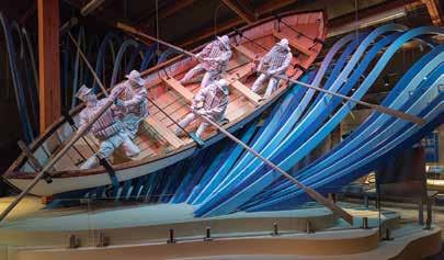 The unique construction of the massive edifice is largely thanks to the creative mind of Wilmingtonbased architect John Parker. He was hired for the project after initial talks of creating a museum to display maritime artifacts began during the mid-1980s – not long after the U.S.S. Monitor was recovered off the coast of Cape Hatteras. As the first ironclad U.S. naval ship to sink in a storm in 1862, the Monitor was sent to The Mariners’ Museum in Newport News, which spurred local Hatteras Island community members to advocate for a dedicated space closer to home in order to house similar historical artifacts discovered both in and around Outer Banks waters.