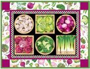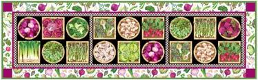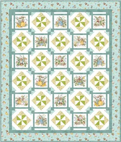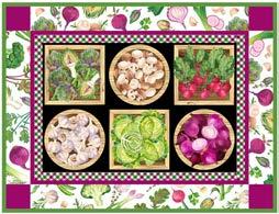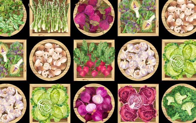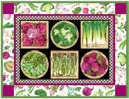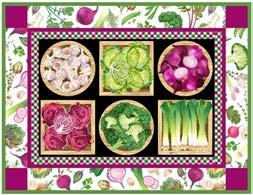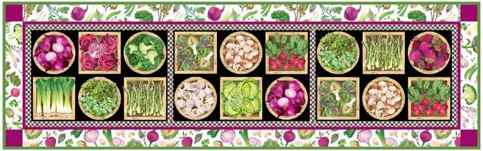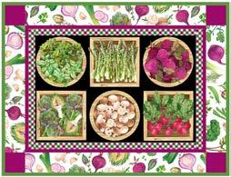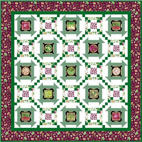 Fussy cut 5 1/2” squares from the “trays” of vegetable print in this collection to serve as the center square of the churn dash blocks, ties the churn dash blocks together with alternating chain blocks