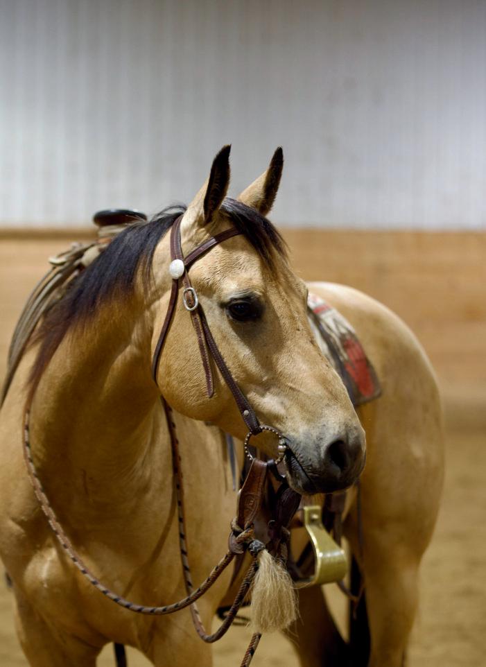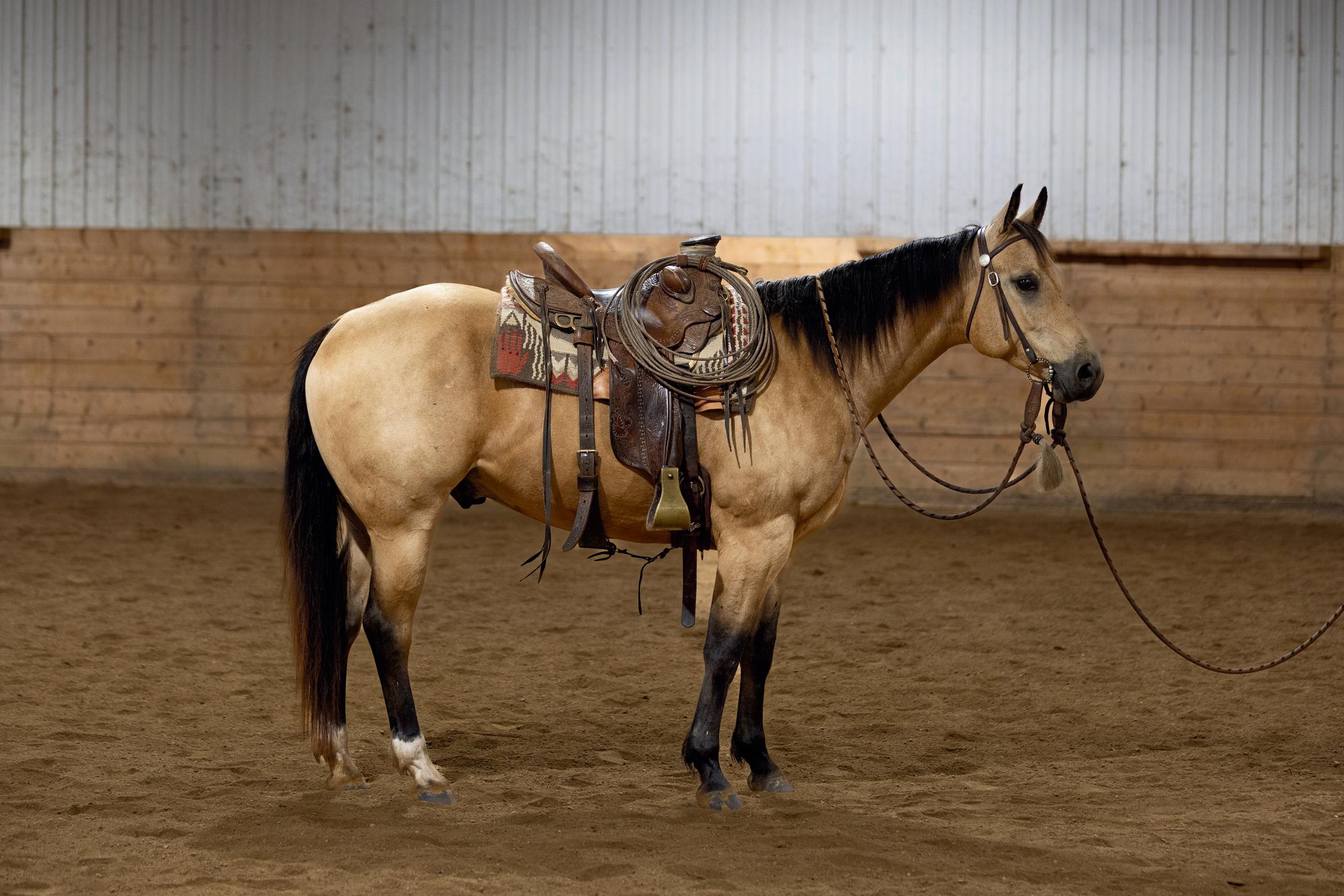 Meet Stuart, a 2021 AQHA gelding standing a solid 16 hands high with an eyecatching buckskin coat and an even better disposition. Papered as JXL Mighty War Bar, Stuart is the kind of horse that makes every ride enjoyable. He’s the definition of in your pocket—friendly, easy to catch, and always eager to be around people. Stuart is an easy-going soul with a calm mind and a willing heart. He’s confident tracking cattle, has a smooth, easy-moving canter, and is eager to please his rider every step of the way.