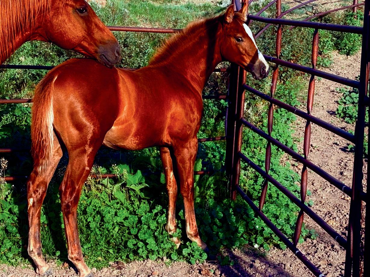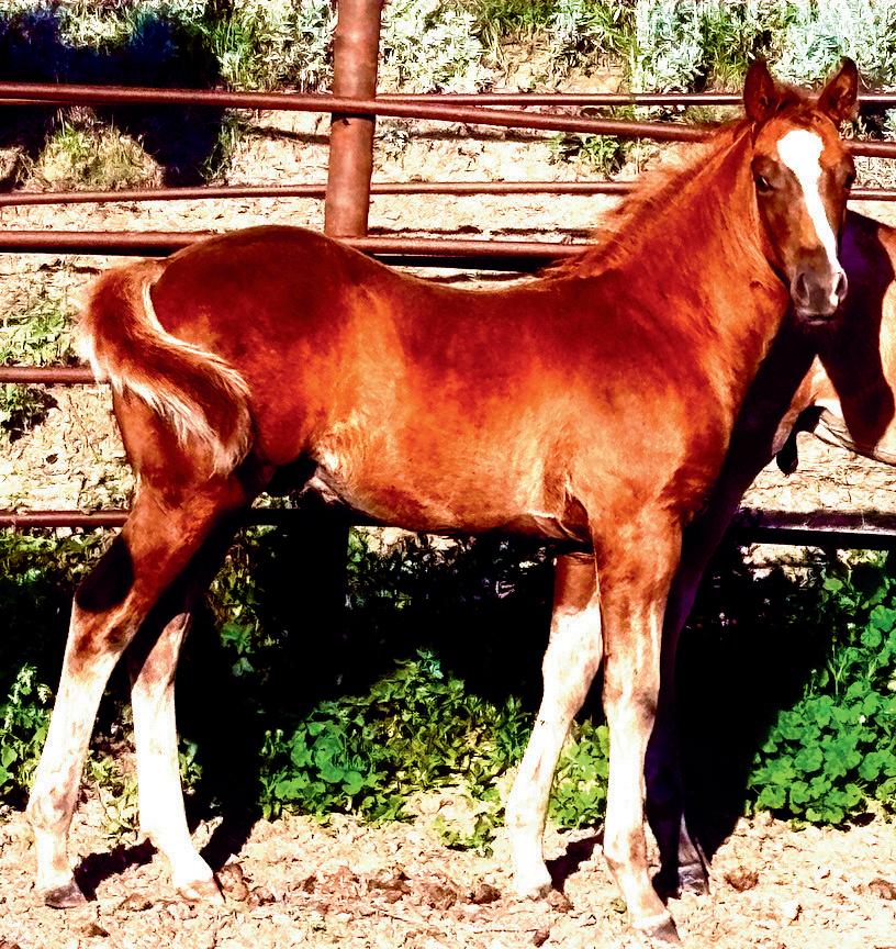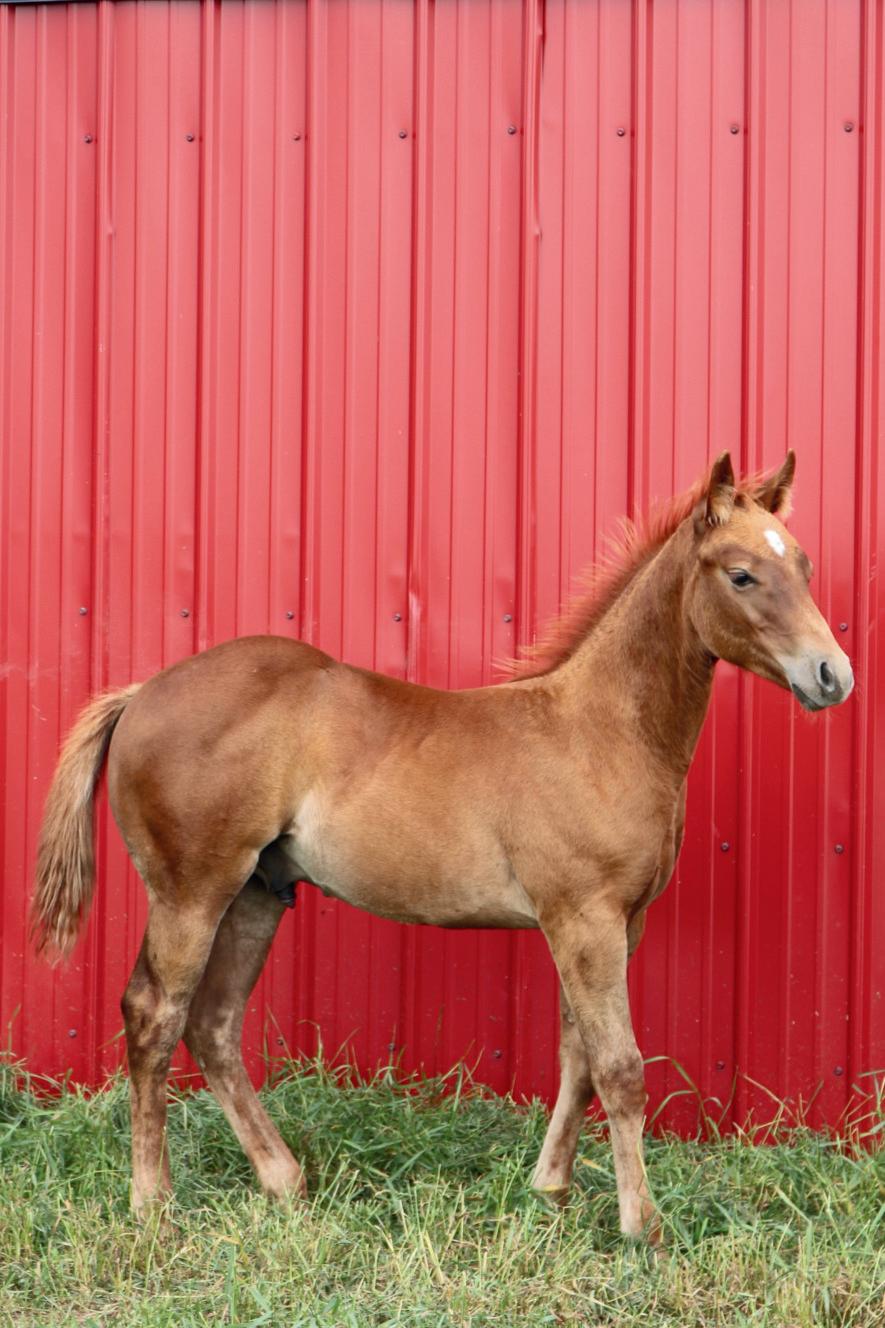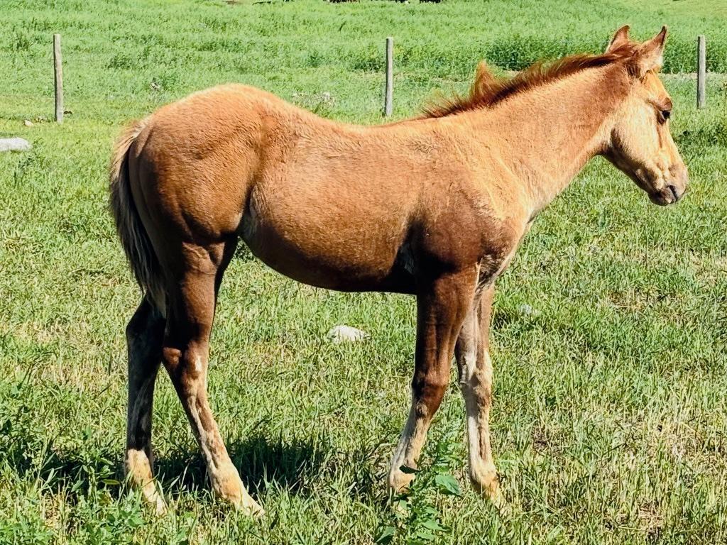 "Bo" is a sorrel stud colt born in May 2025. The guesswork on the outcome of this colt and his future potential has been eliminated due to his proven genetic background. He is sired by "Smokin N Rockin" who has 167 AQHA points in heading, heeling and working cow horse. His dam, "Bone Dun Gun Silver" is a 15.1, solid working ranch mare out of PG Dun Gun who had 148 AQHA points in open performance in heading, heeling and calf roping as well as two time, top 10 in the world show. PG Dun Gun was sired by the legendary Playgun. This colt has good confirmation and is showing good athletic ability and disposition. He is eligible for the following incentives: