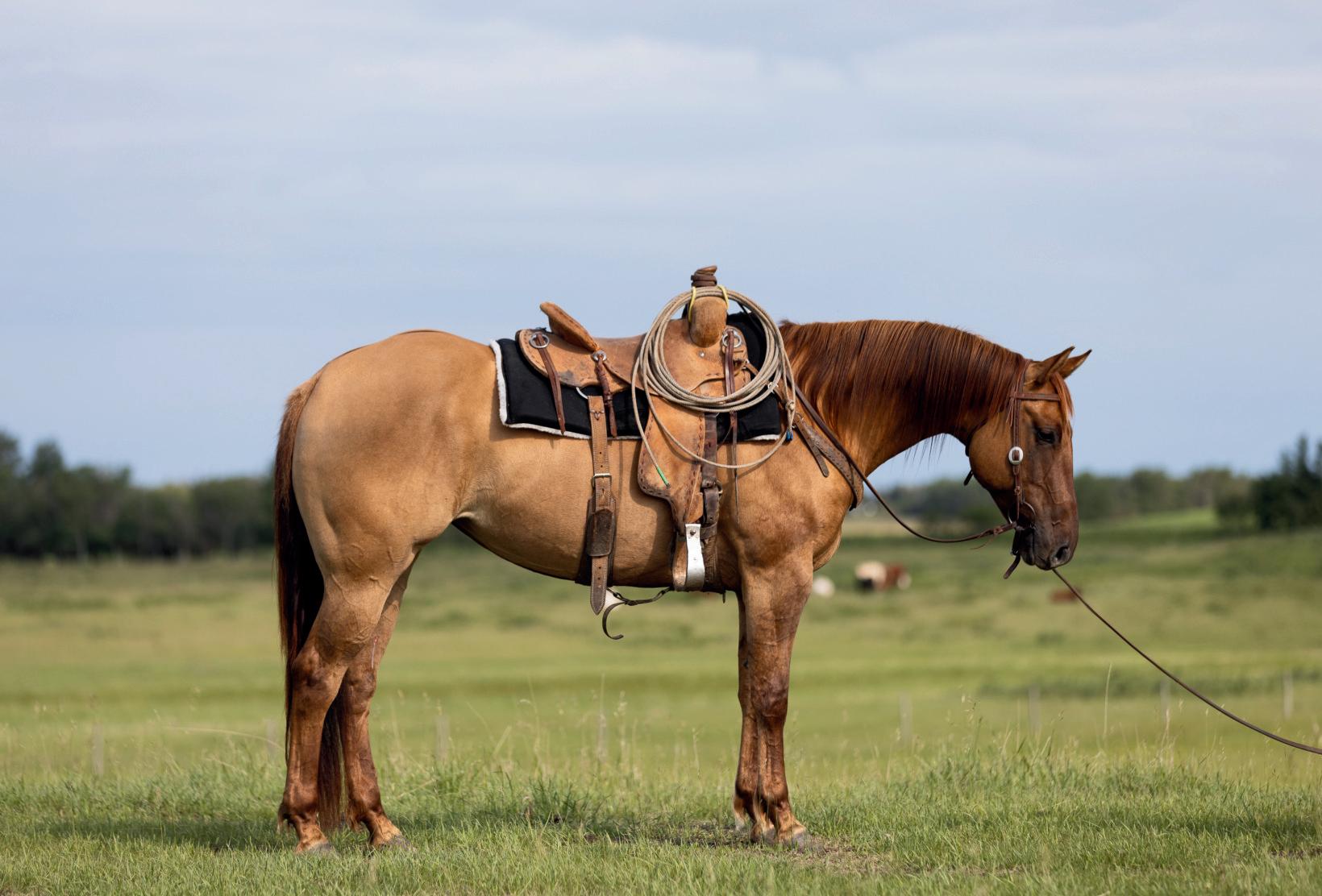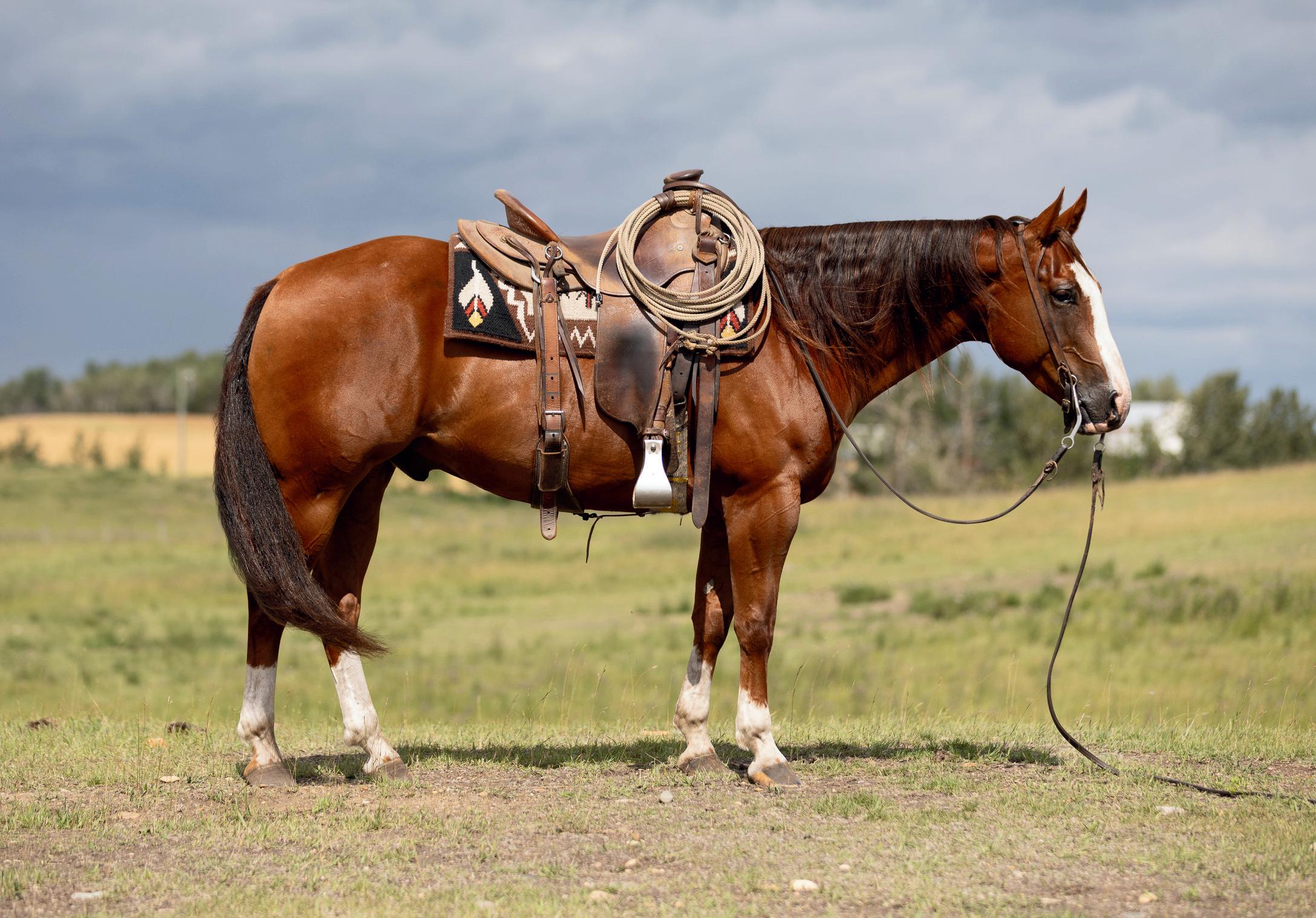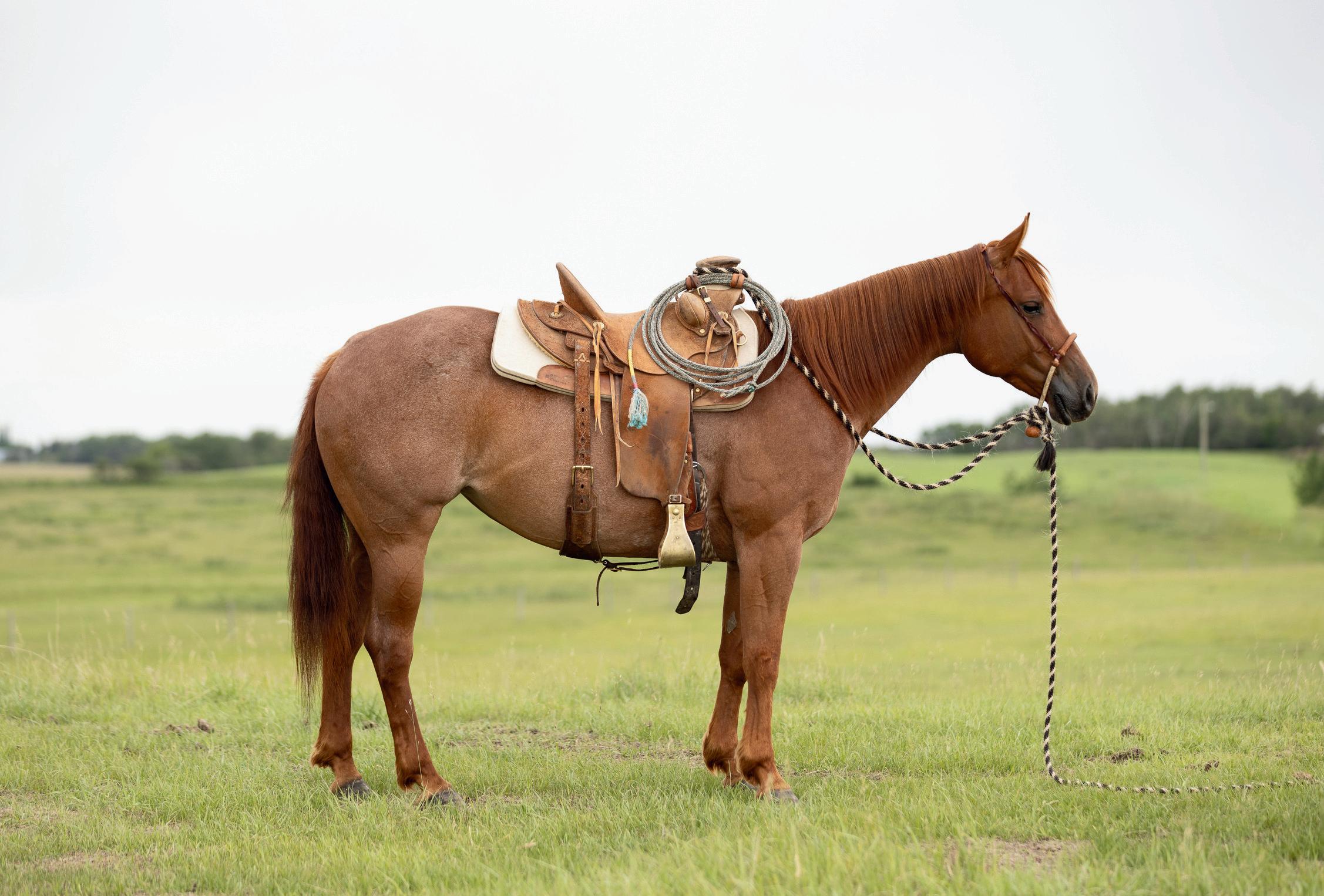 "Red" is a strong, quiet, flashy sorrel gelding that will make an excellent addition to anyone's herd. At 7 years old and 15hh, Red is ready to go to work. Whether you need him as your next go to ranch. pasture, branding, arena or trail riding horse, Red will be your main mount. Red is sired by Truders Skip A Bar and is out of HOH Cotta Get Me One. Red is strong, straight legged and good footed. He requires no special maintenance and has always been sound. He is an easy keeping horse, both in summer and winter. He is up to date on vaccines (Vetera gold) and has had his teeth floated this summer. As a ranch horse, Red has been used for moving and sorting cows. He has been used in the pasture to rope and doctor cows and calves and has been hauled to brandings. One of Red's best qualities is his attitude. He has an excellent disposition and wants to please. He is casy to catch and will meet you at the gate. He is confident when riding out alone or with other horses and will go in any direction you point him in. He does well with time off and inconsistent riding and is the same horse that you turned out in the pasture months ago. He is comfortable around kids, dogs, vehicles and equipment. Rad is our go to trustworthy horse when riding with or leading our 2 year old son.Please contact Clayton Loewen (306) 260-2853 for additional information. We will be sad to see Red go but are looking forward to seeing him excel with a new rider.