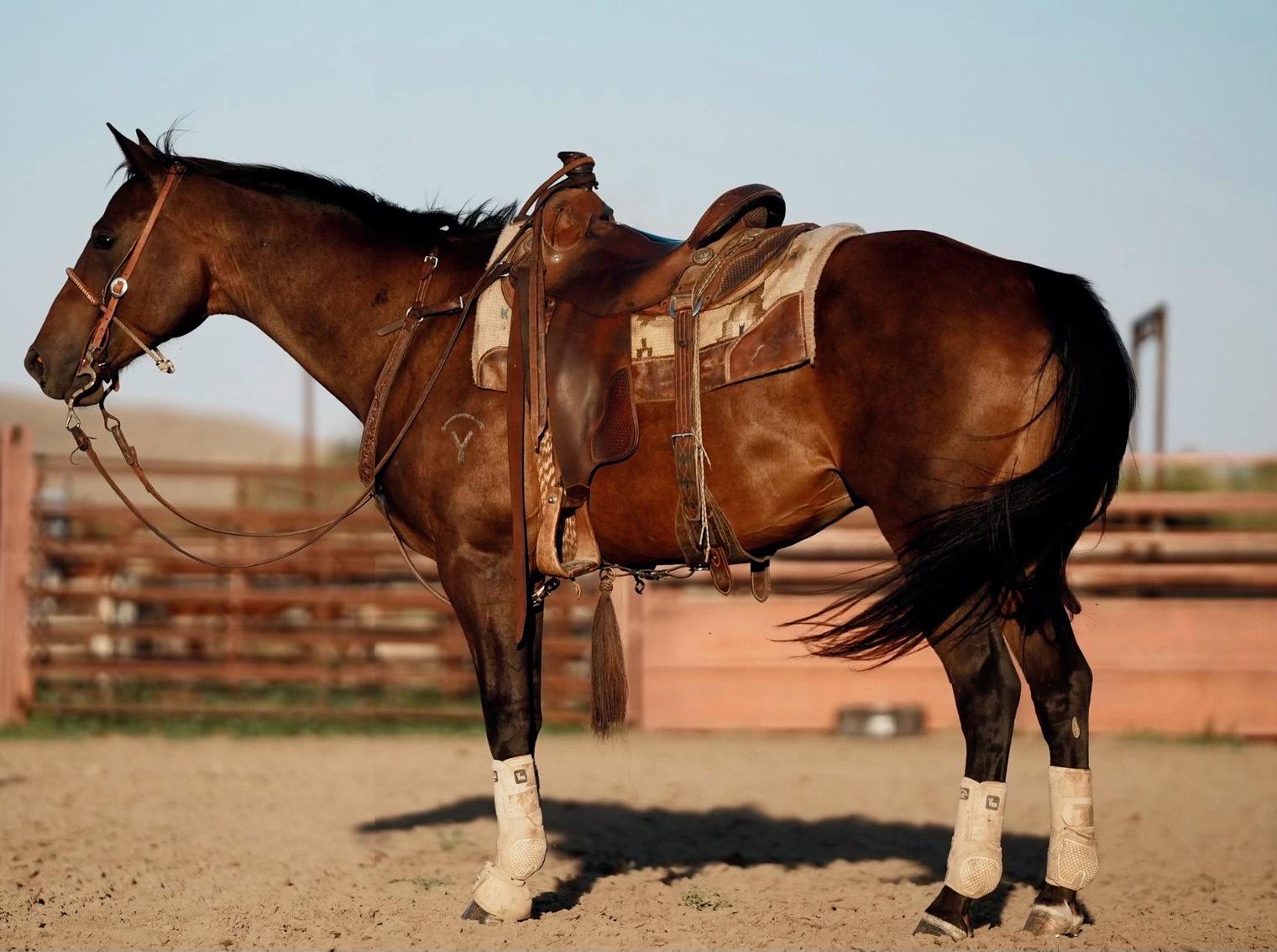 Major has a solid foundation and the mind to go in any direction.-ranch work, trails, performance, or just a great all-around partner. He's the Kind evenyone is looking for: smart, willing, and easy to handle. Major is a seasoned horse when it comes to travelling. Easy Keeper on the road; eats and drinks well. Low fuss Kind of guy at the rodeos; standing flat footed with a loud crowd and bright lights. He has been hauled to some high school rodeos and used as a breakaway horse in the jr girls. Major has been used on all aspects of the ranch including the branding season to drag calves. He's also ran steers both ends in the practice pen at home.